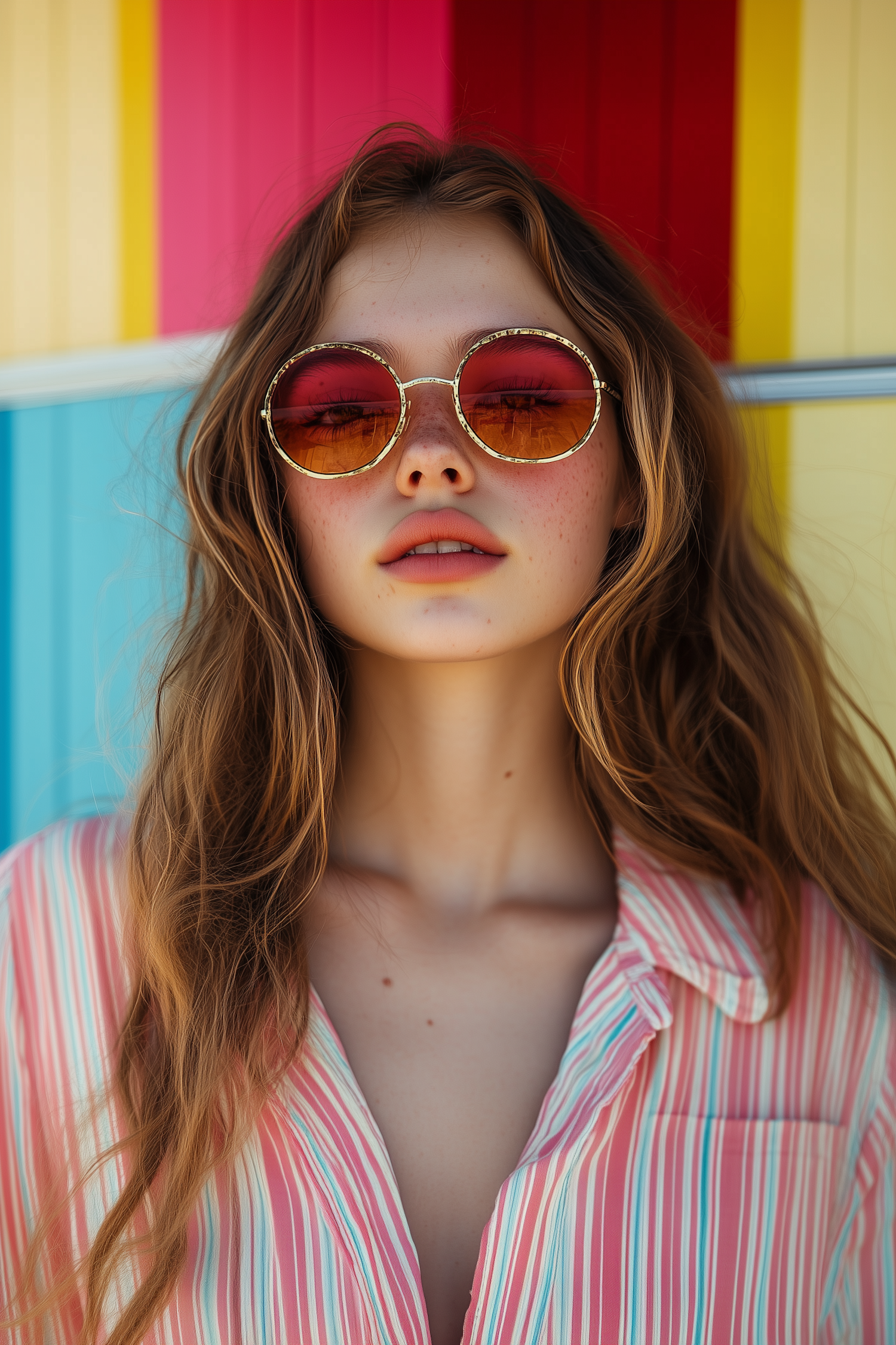 Stylish woman with wavy hair, gradient sunglasses, and a striped shirt against a colorful, summery background. Vibrant and trendy vibe.