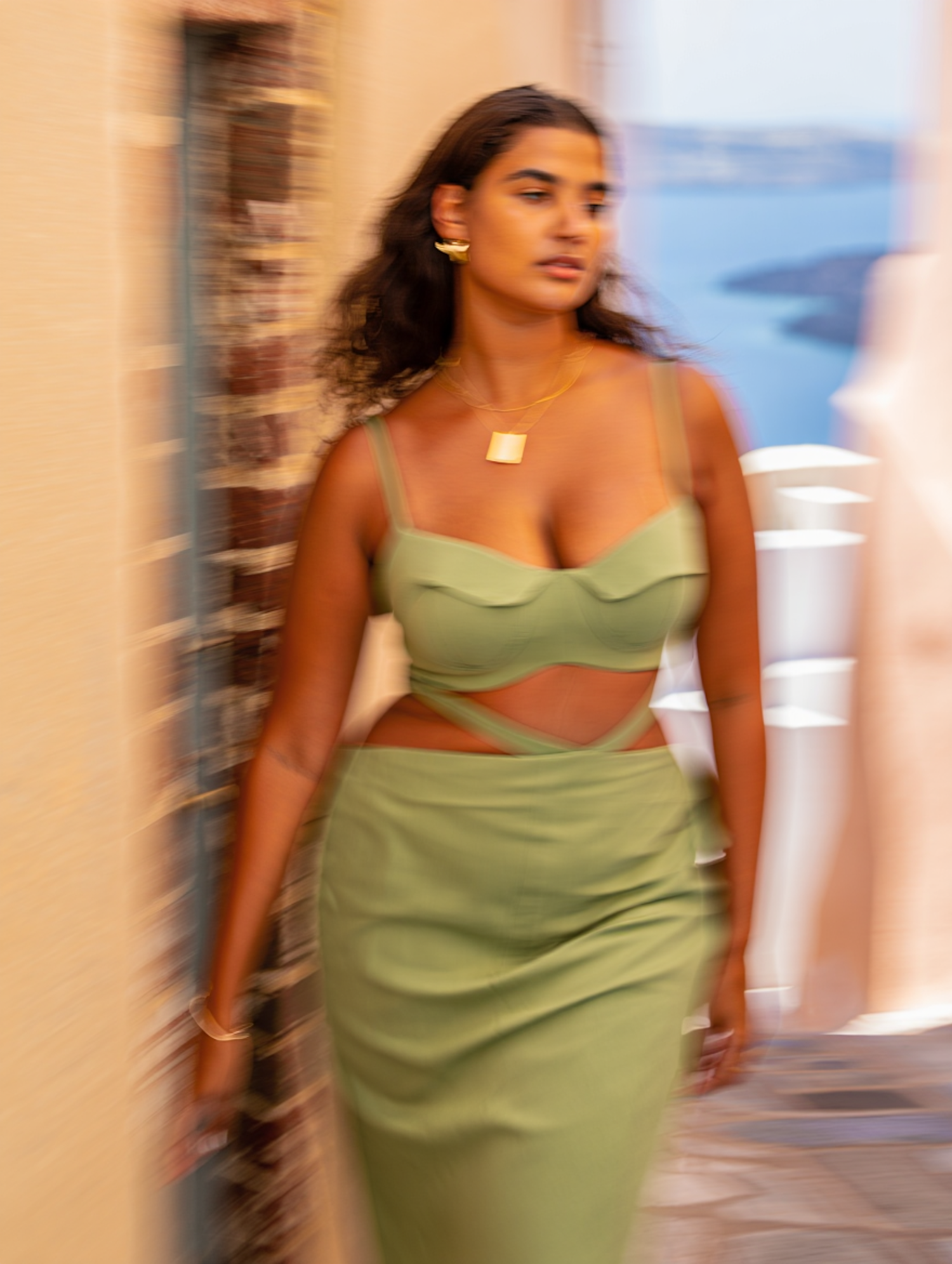 A stylish woman in a green dress and gold accessories strolls through a seaside alley, with a blurred sunlit coastal backdrop.