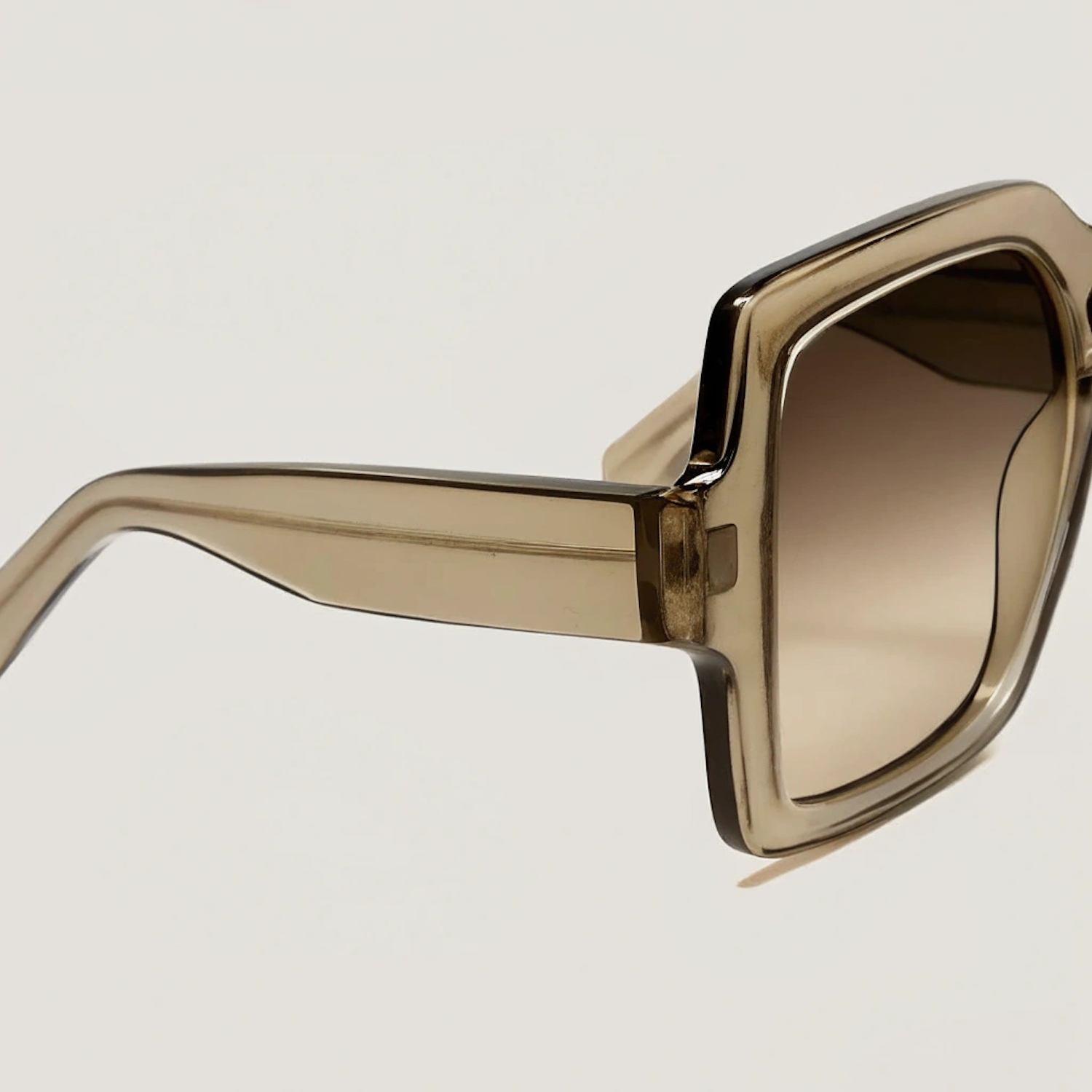 Close-up of trendy oversized square sunglasses with translucent beige frames and gradient-tinted lenses, set against a light beige background.