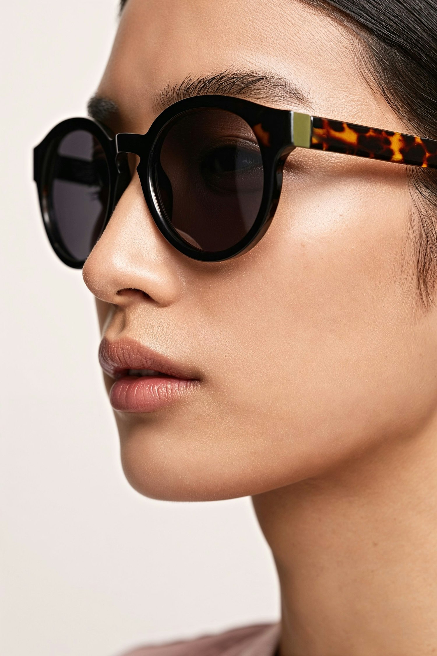 Close-up of a person wearing chic round sunglasses with tortoiseshell temples and gold accents, set against a neutral background.
