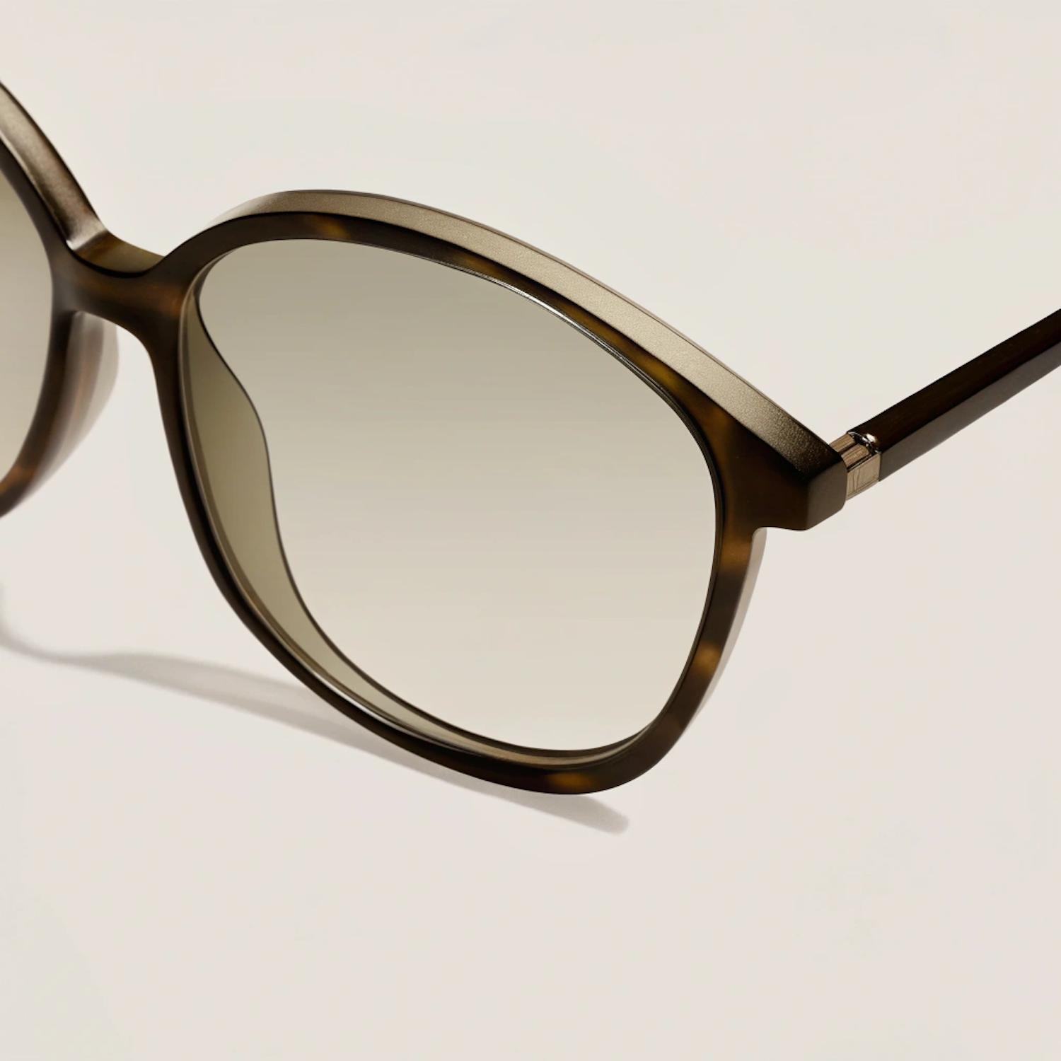 Close-up of tortoiseshell sunglasses with gradient lenses and metallic accents, set against a neutral beige background.