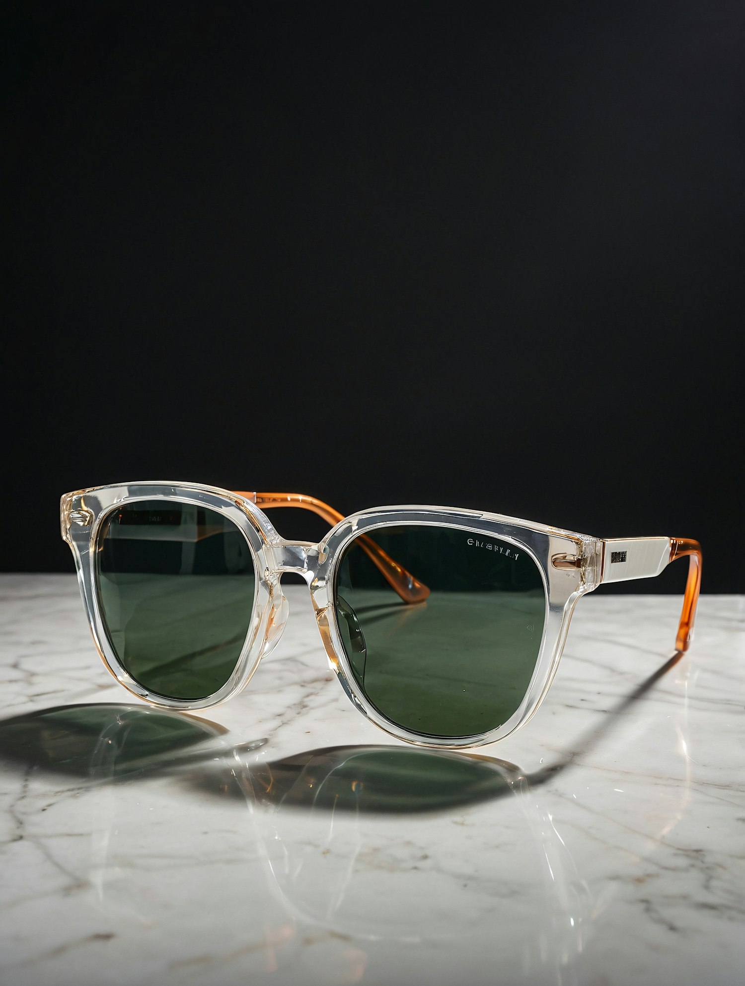 Transparent sunglasses with green lenses and orange arms on a marble surface, set against a sleek black background.
