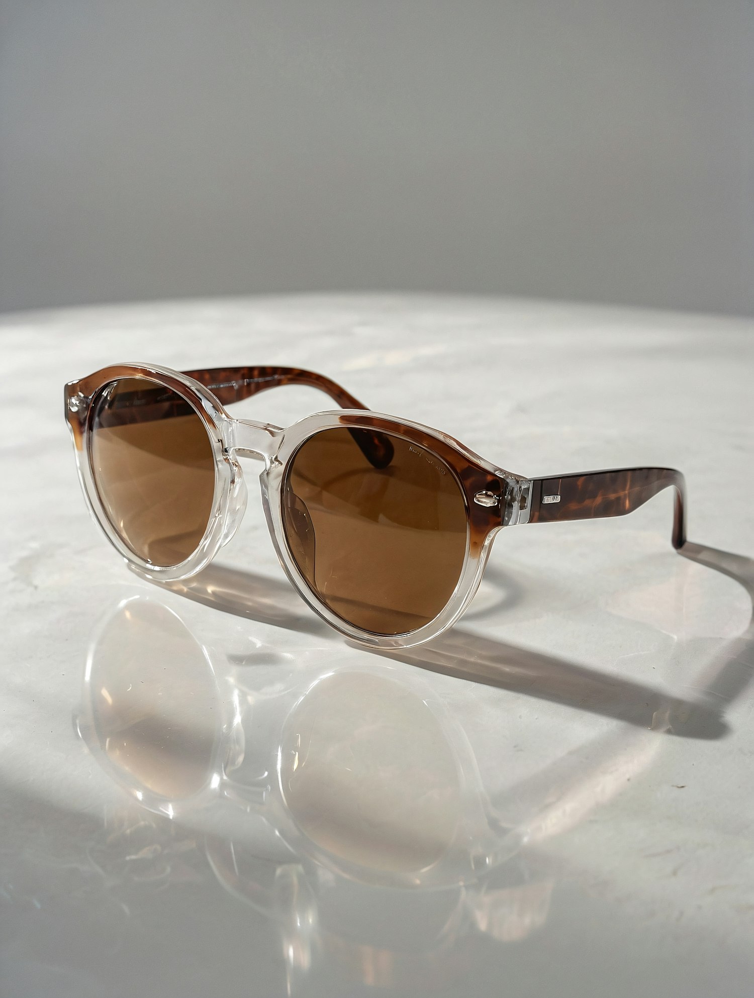 Stylish sunglasses with clear and tortoiseshell frames, brown-tinted lenses, and soft reflections on a smooth surface.