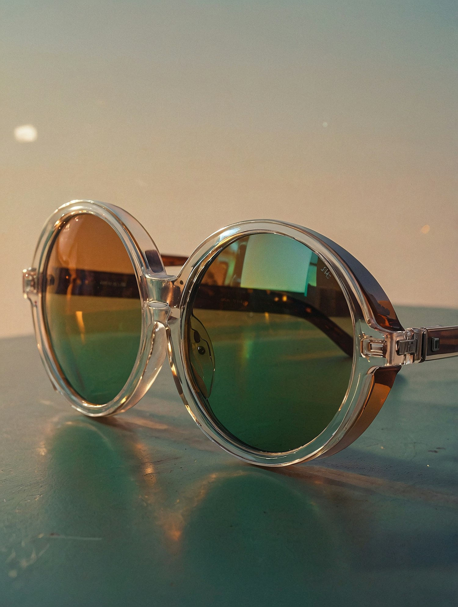Round sunglasses with transparent frames and green-brown gradient lenses, set against a warm sunset gradient background.