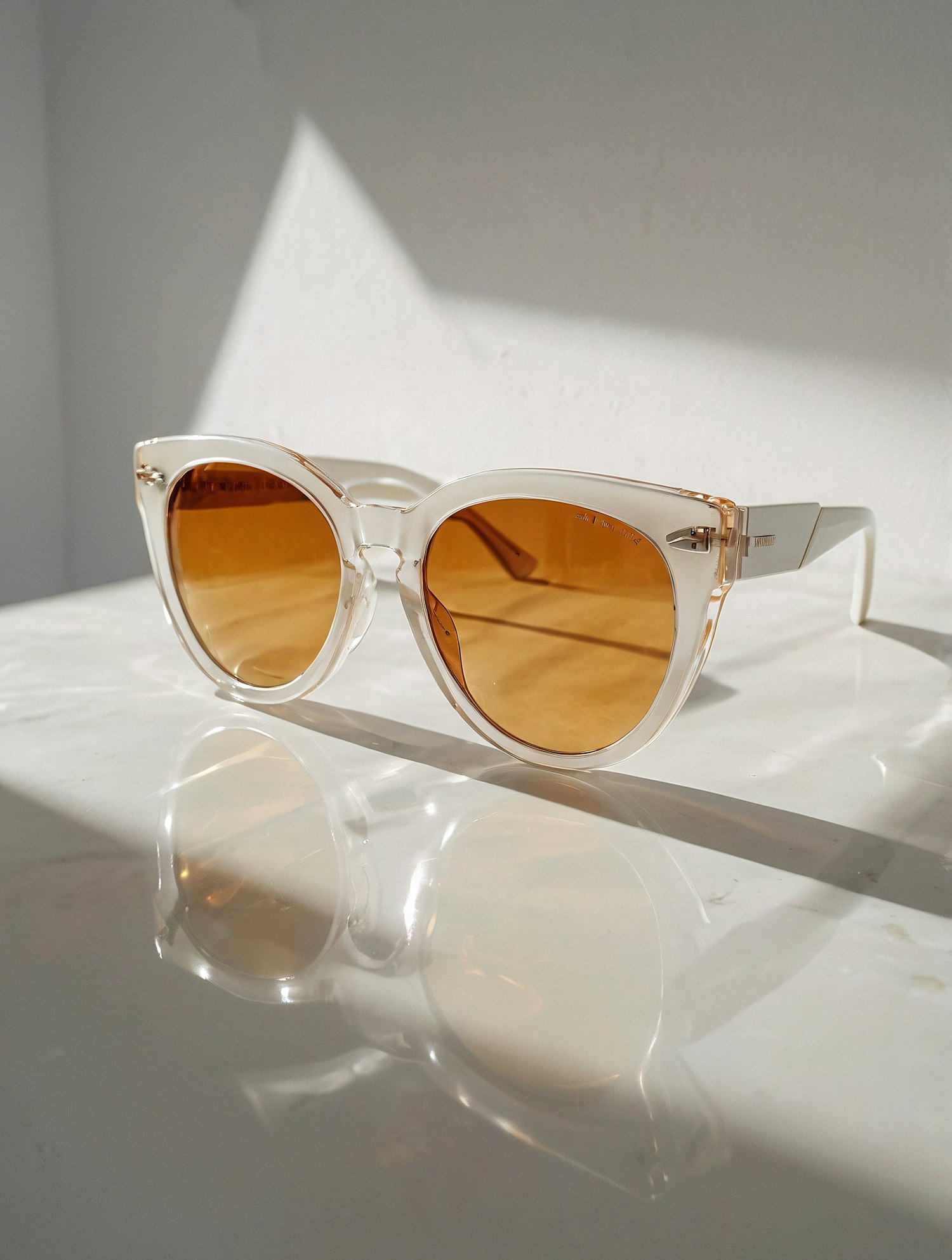 Transparent-frame sunglasses with amber lenses on a glossy surface, bathed in soft sunlight with a minimalistic white background.