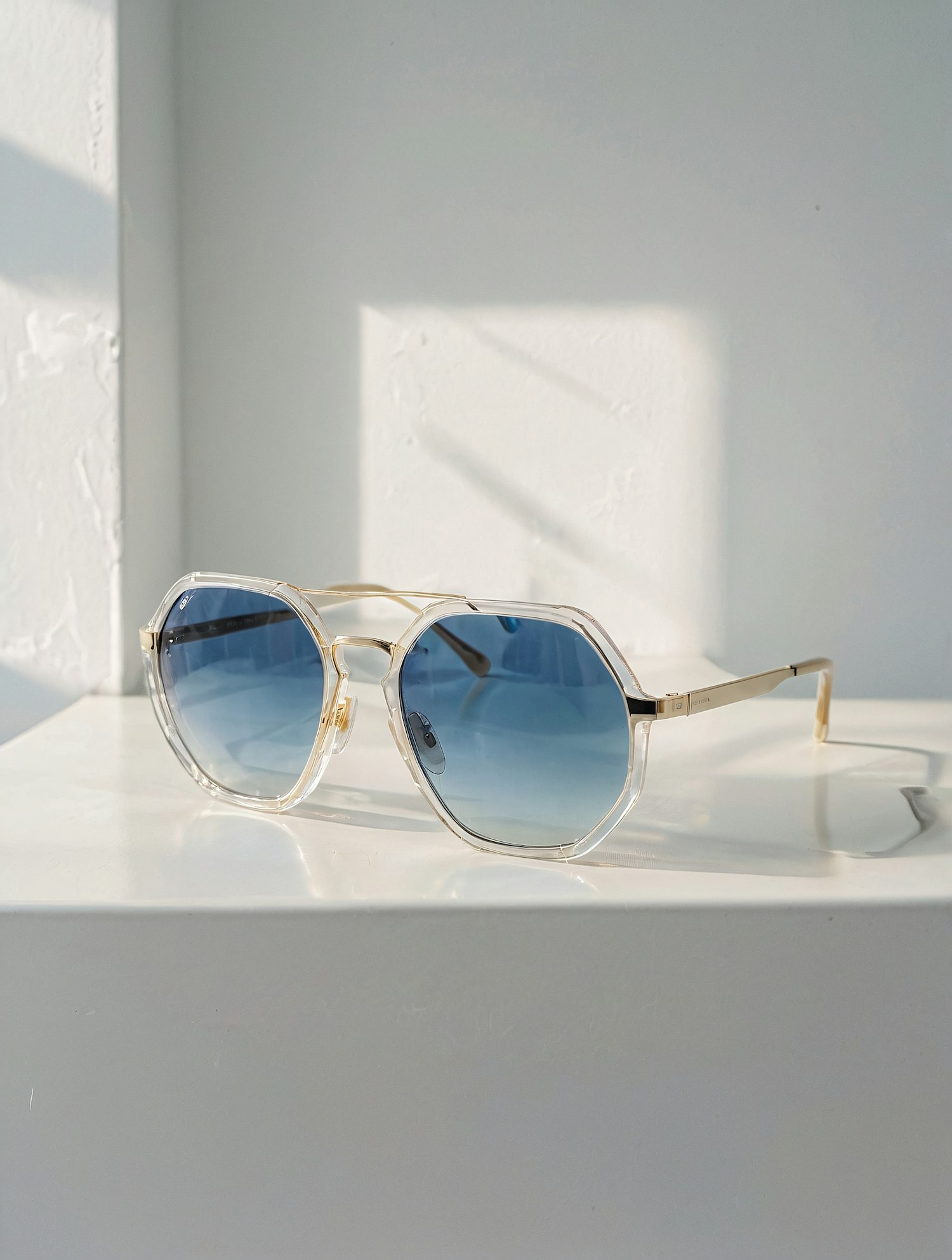 Transparent-frame sunglasses with gradient blue lenses and gold accents, resting on a white surface in soft natural light.