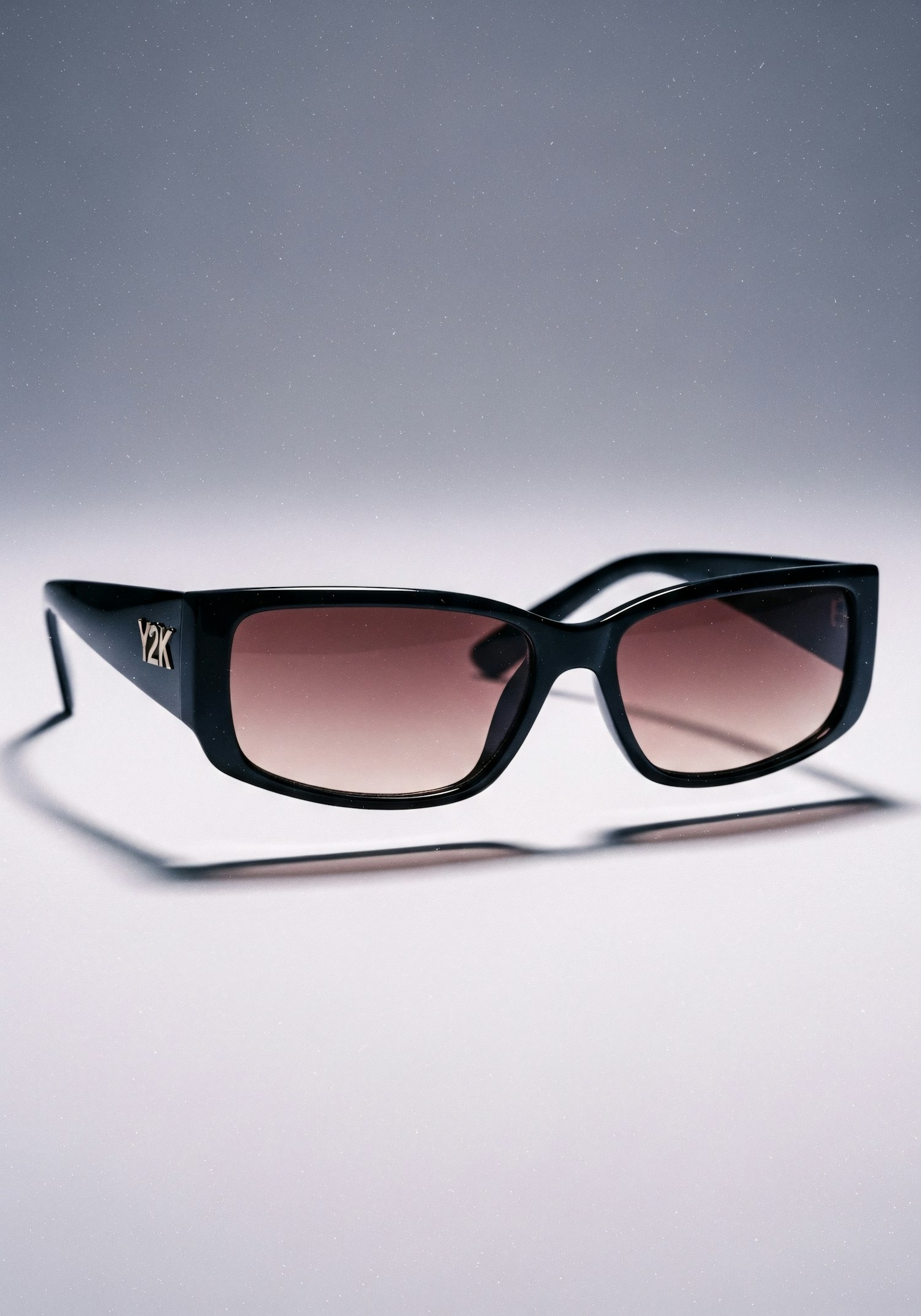 Stylish black sunglasses with gradient lenses and a 'Y2K' logo, set against a softly lit gradient background.
