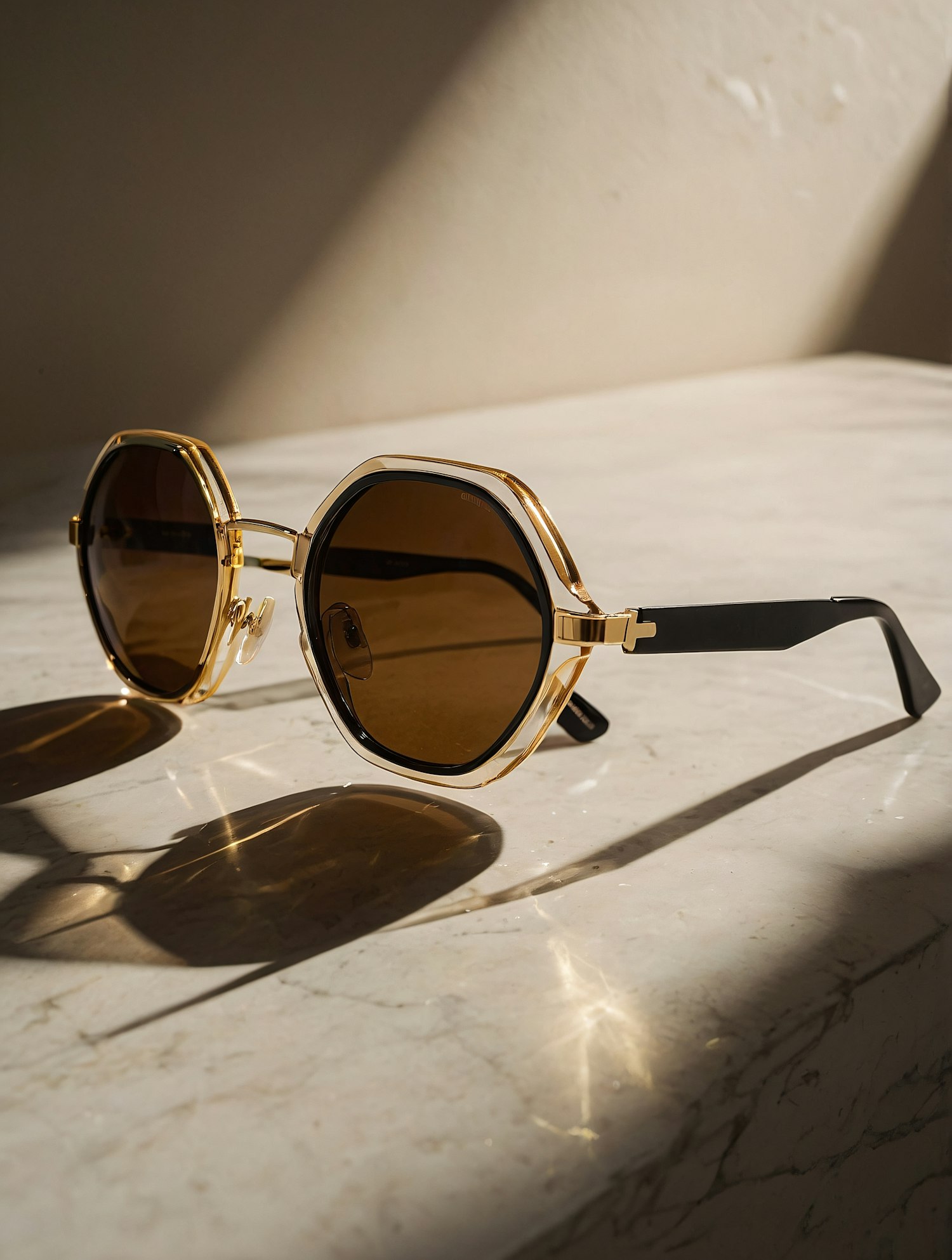 Elegant gold-framed sunglasses with brown lenses and black temples resting on a marble surface, bathed in soft, natural light.