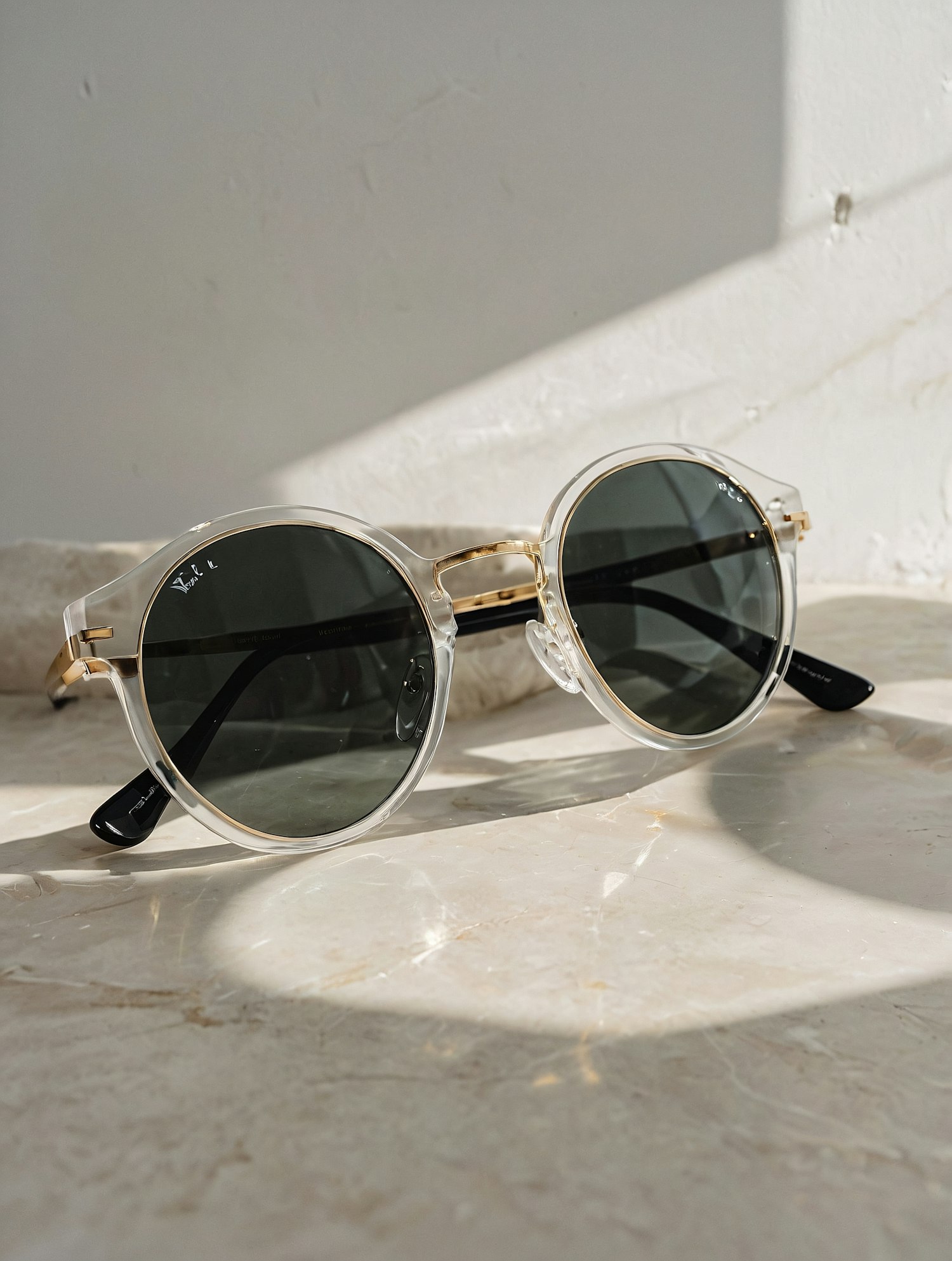 Round sunglasses with clear frames, dark green lenses, and gold accents on a marble surface, bathed in soft sunlight.