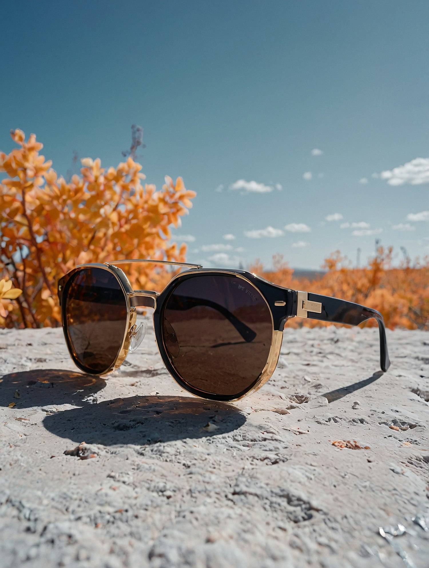 Stylish sunglasses with gold and black frames on a stone surface, set against vibrant orange foliage and a clear blue sky.