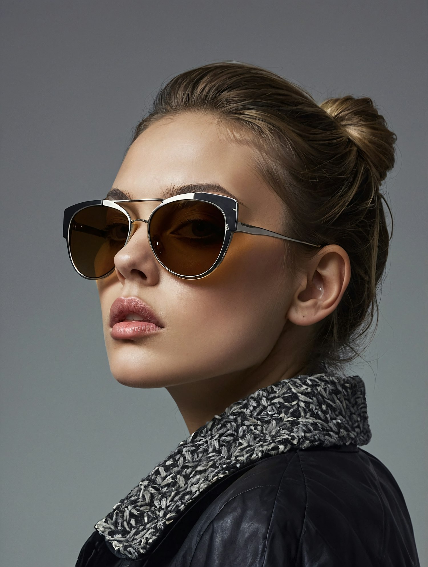 Stylish woman in sunglasses and leather jacket exudes confidence with a sleek bun and textured collar against a neutral background.