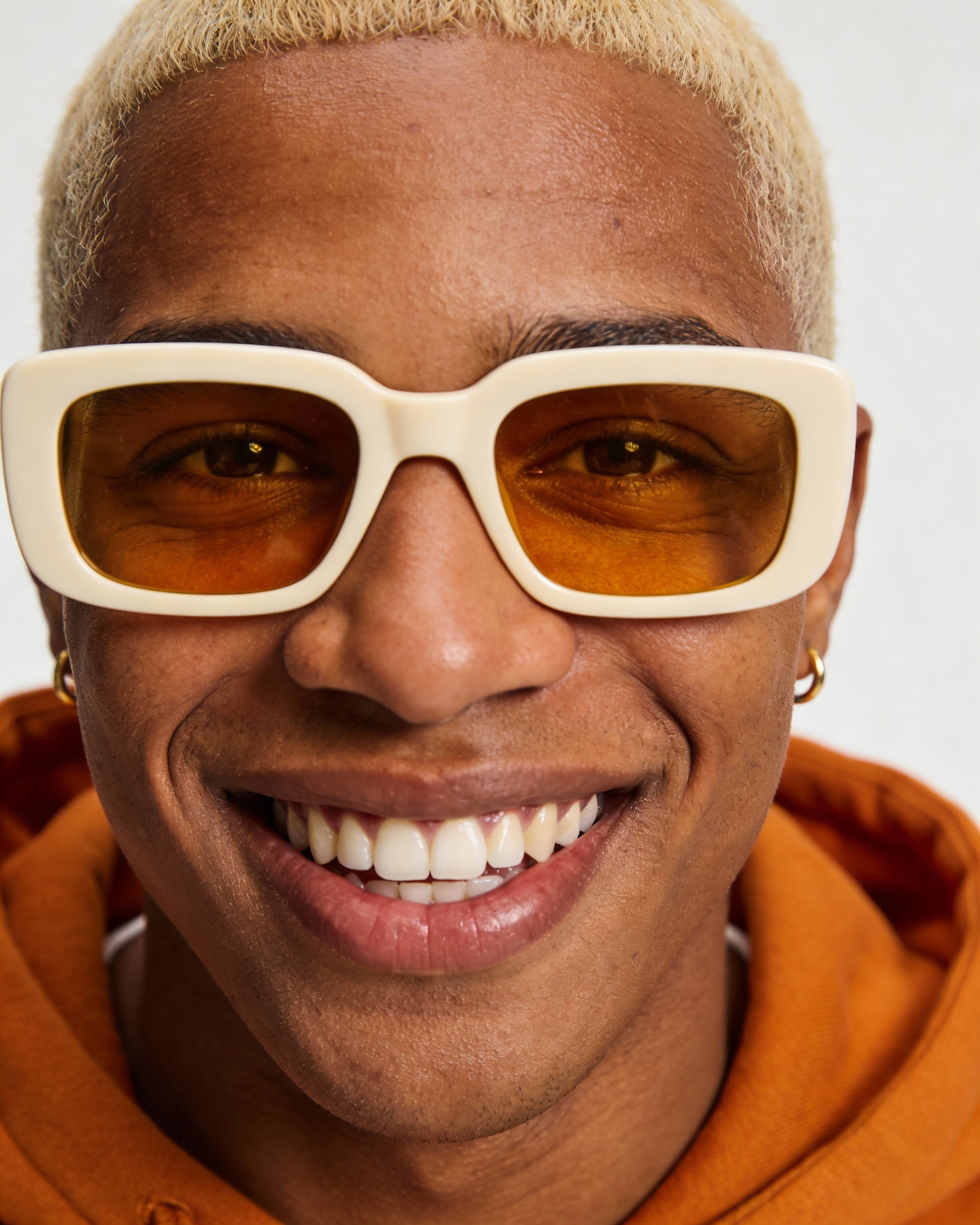 Close-up portrait, straight-on angle. Smiling man with short blond hair, dark skin, wearing matte cream rectangular sunglasses with warm amber lenses, a burnt‑orange hoodie, and small gold earrings. Bright studio lighting, minimal light background. Modern fashion editorial photography, clean and vibrant style.