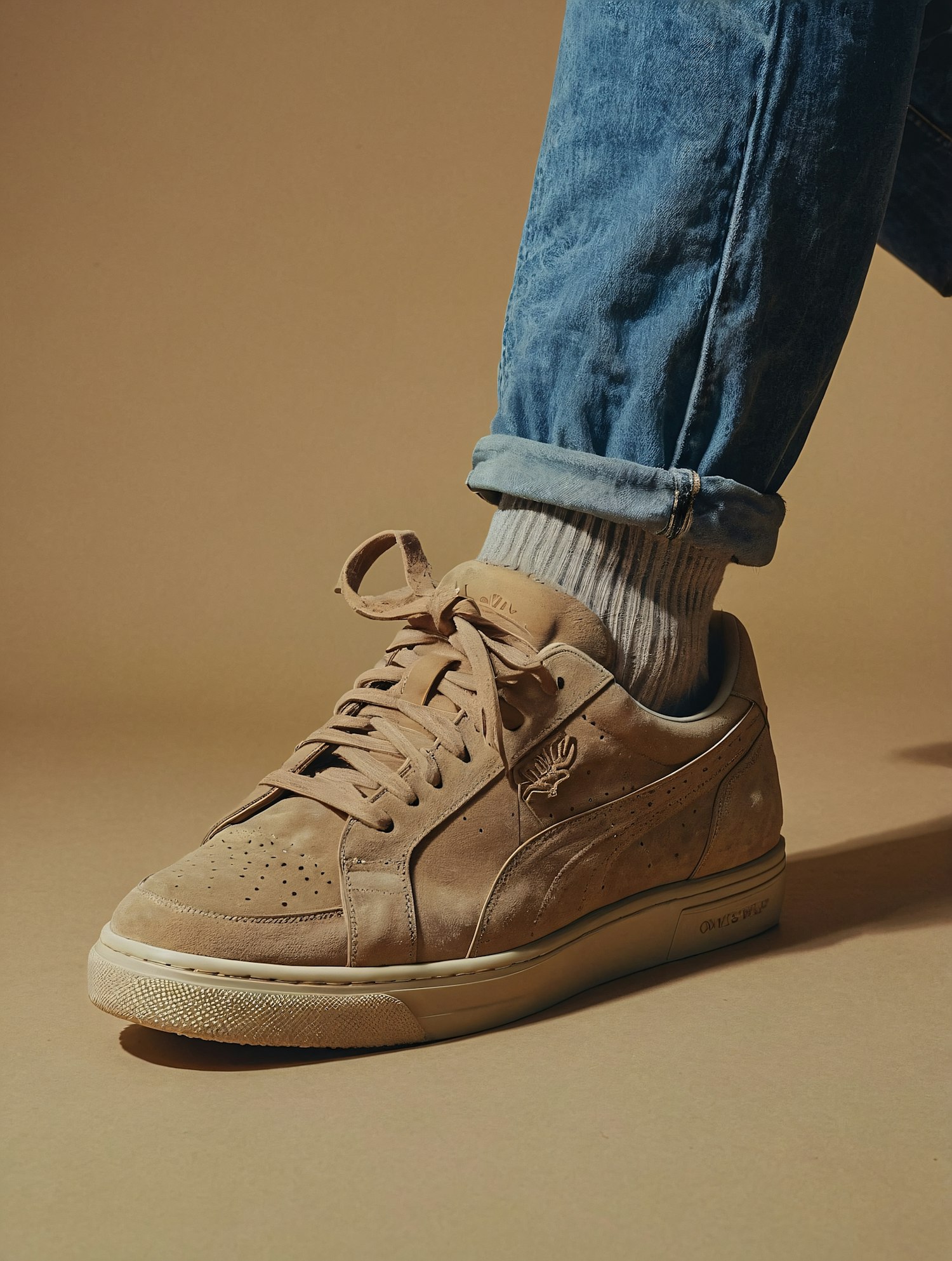 Close-up of a stylish light brown suede sneaker with rolled-up jeans and gray socks on a warm beige background.