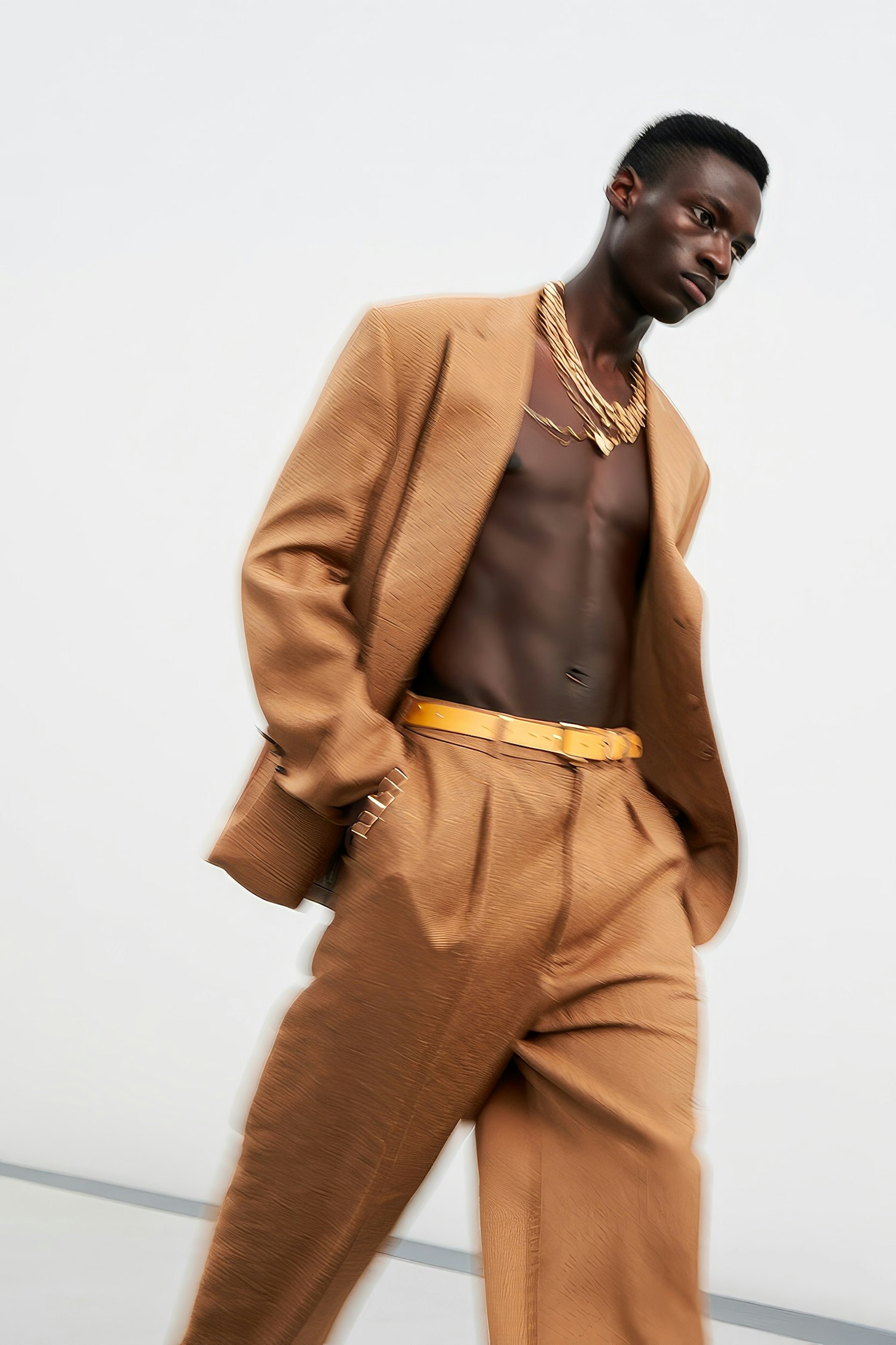 A fashionable person in a tan suit with gold accessories and a yellow belt, captured in motion against a minimalistic background.