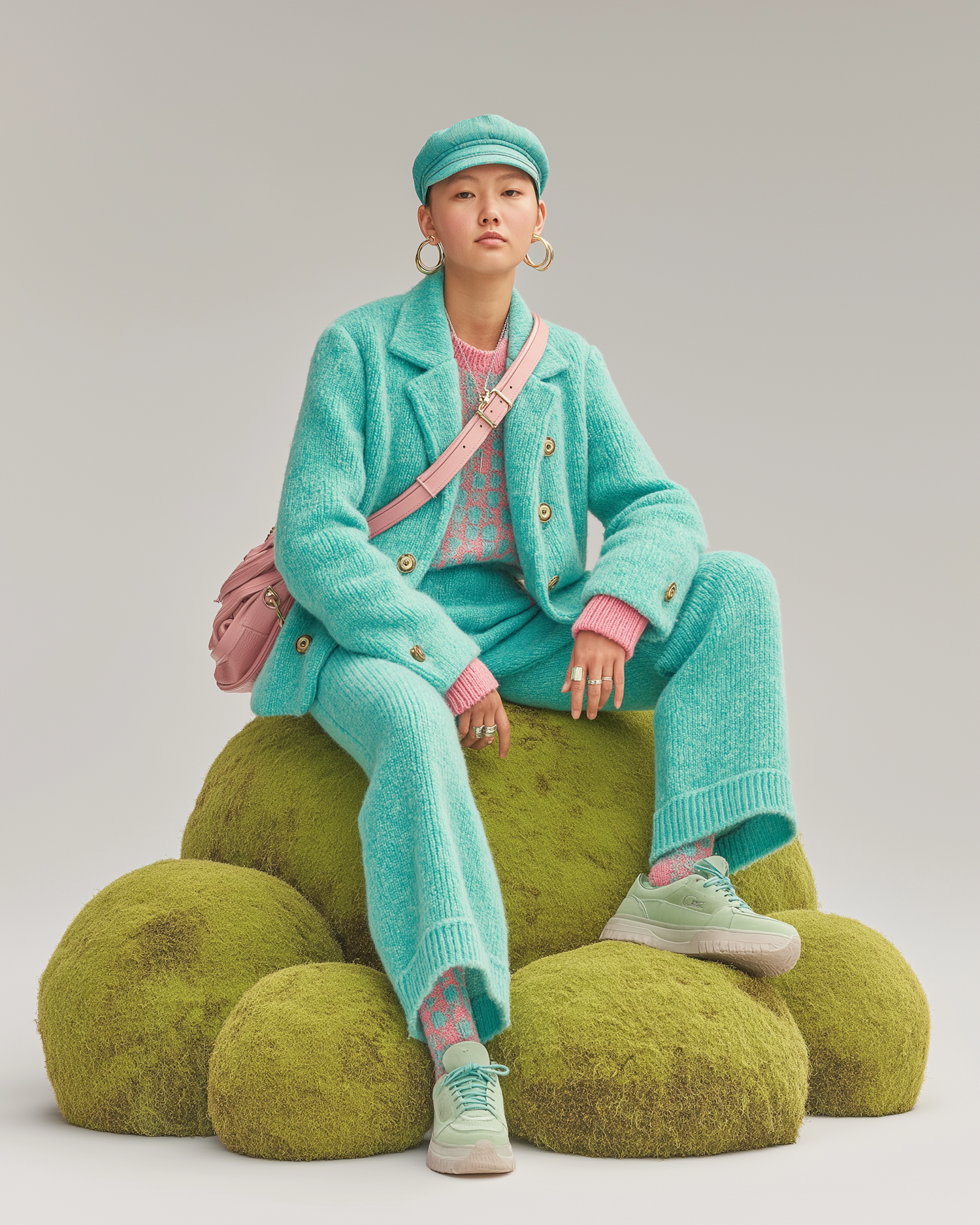 Stylish portrait of a person in a teal wool suit with pink accents, sitting confidently against an artistic green background.