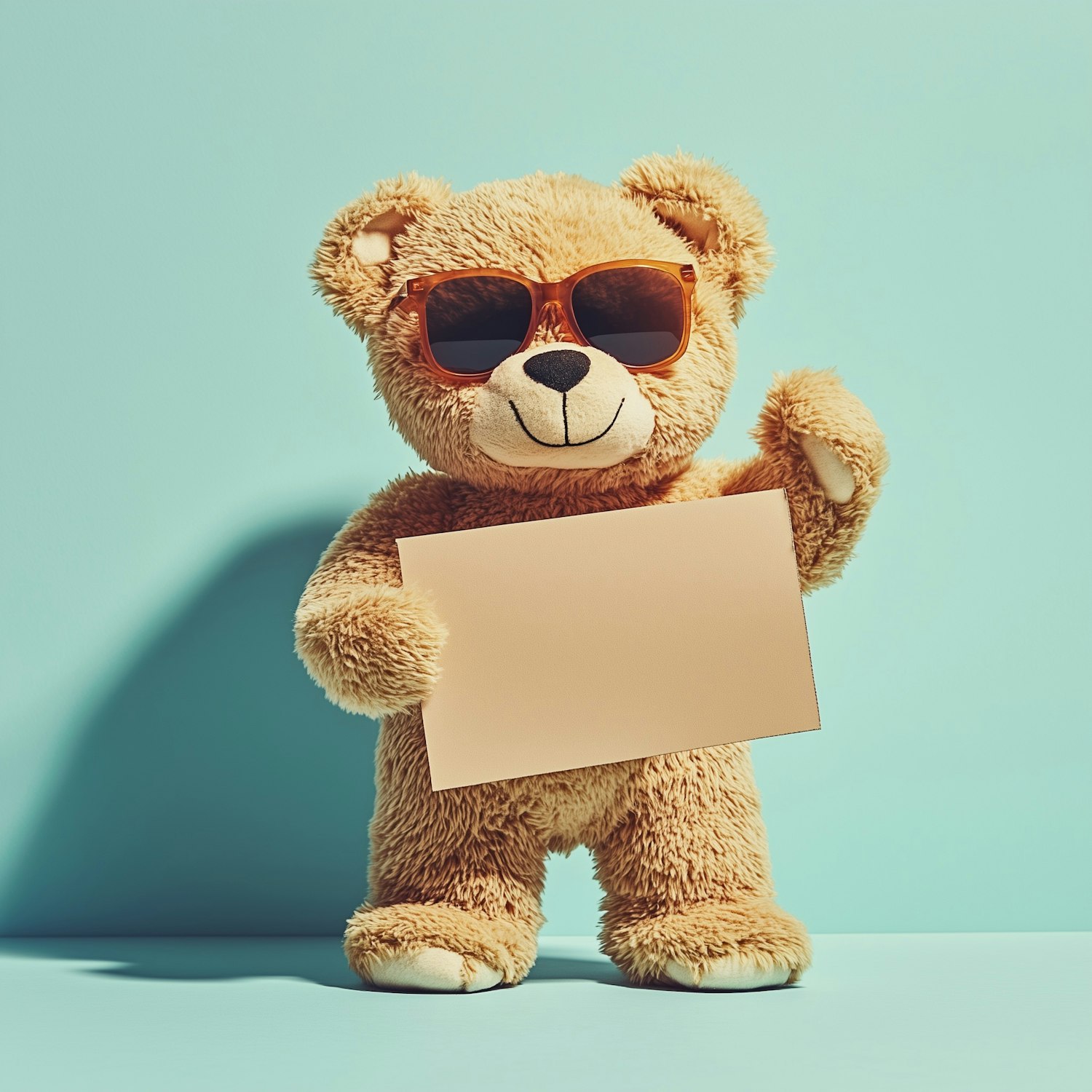 Adorable teddy bear with sunglasses holding a blank card against a pastel blue background. Perfect for creative or promotional designs.