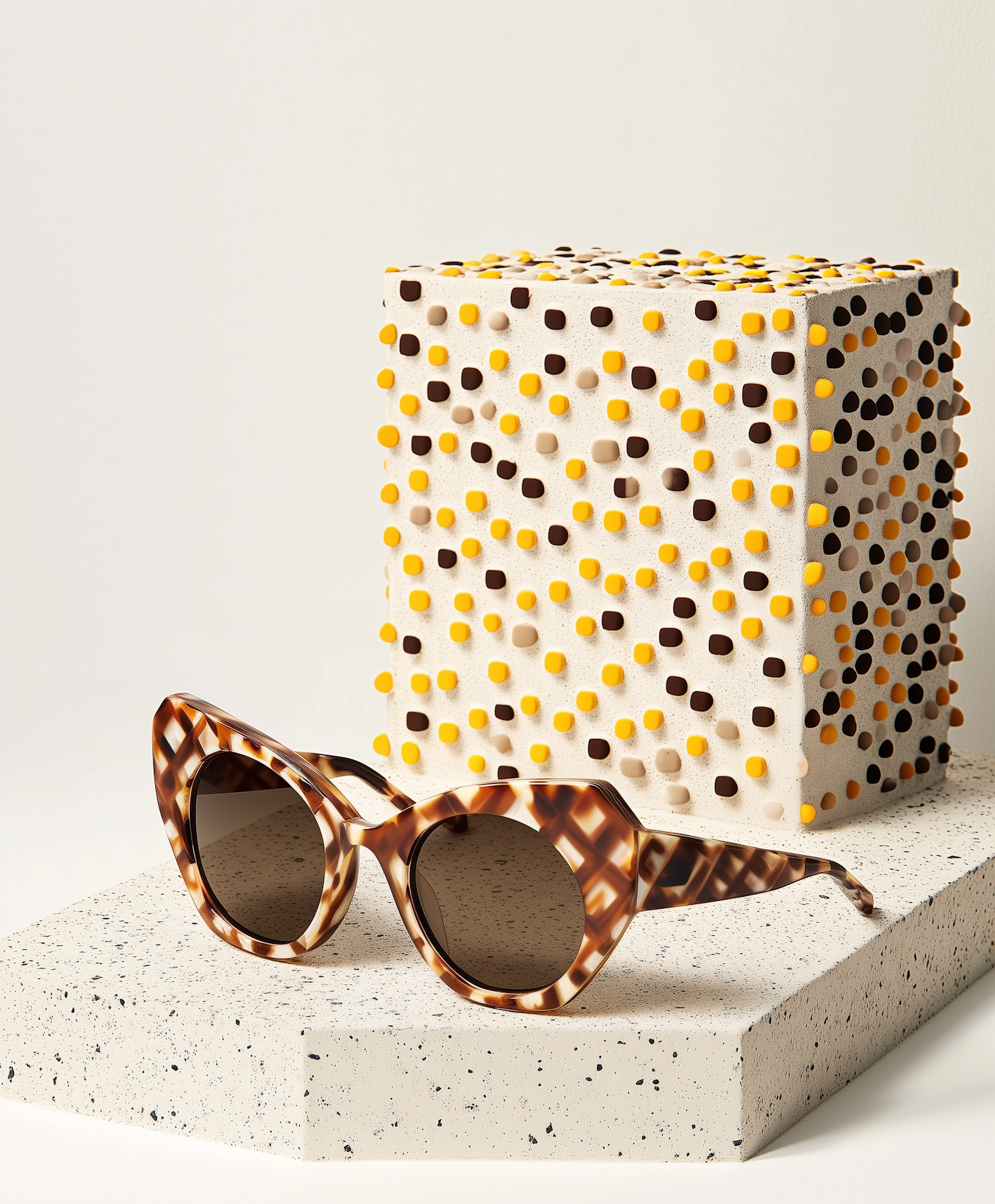 Bold tortoiseshell sunglasses with round lenses on a speckled surface, paired with a dotted, colorful cube in a minimalist setting.