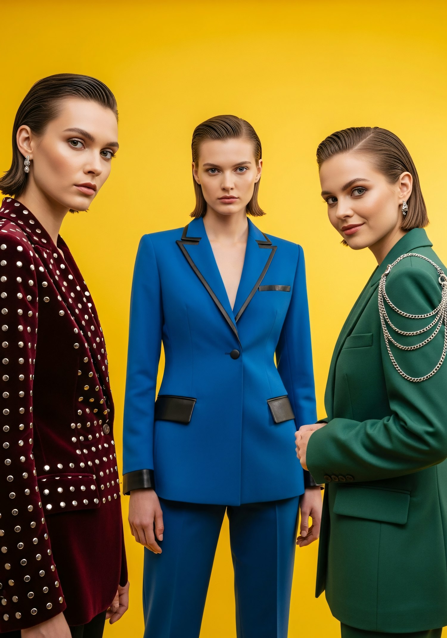 Three individuals in stylish, colorful suits pose against a bright yellow background, showcasing modern fashion and bold design.