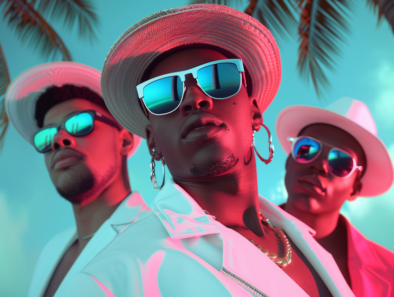 Three stylish men in white outfits and sunglasses under palm trees, with a vibrant pink and blue color scheme.