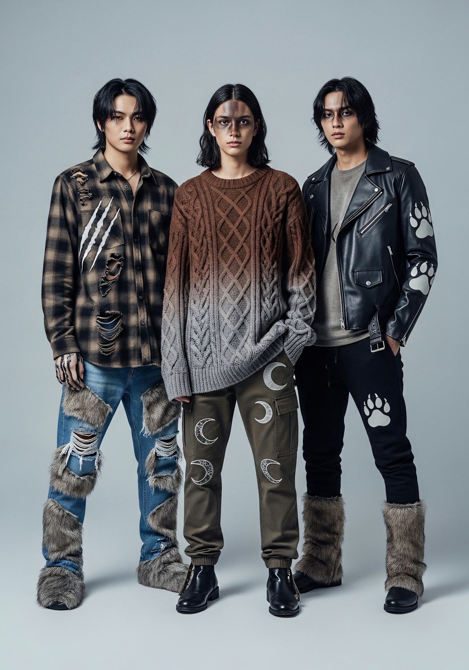 Three individuals in stylish, themed outfits featuring fur accents, moon motifs, and leather details, standing against a plain background.