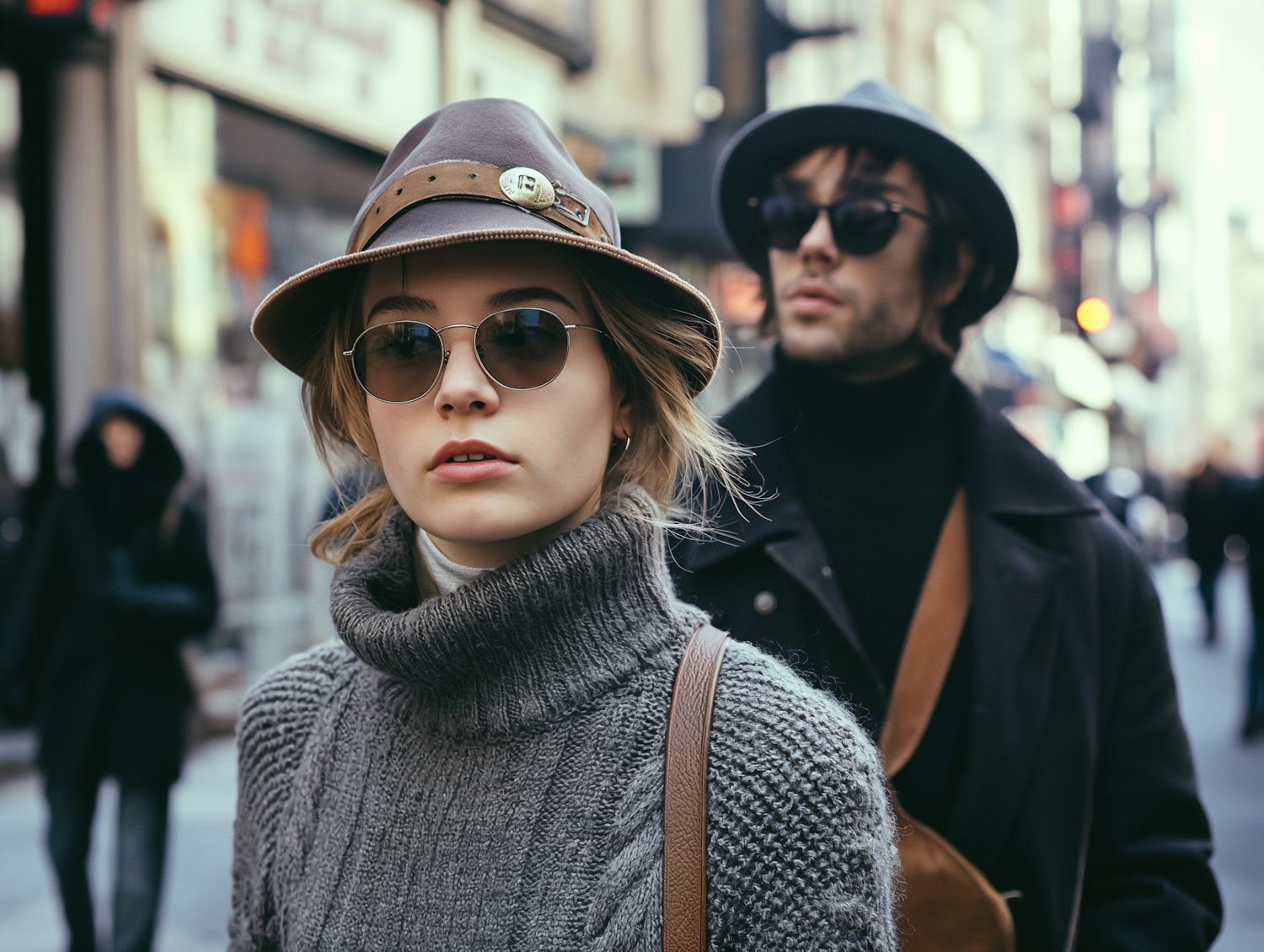 Stylish young woman and man in fedoras and sunglasses walking in a bustling city street, exuding urban chic fashion.
