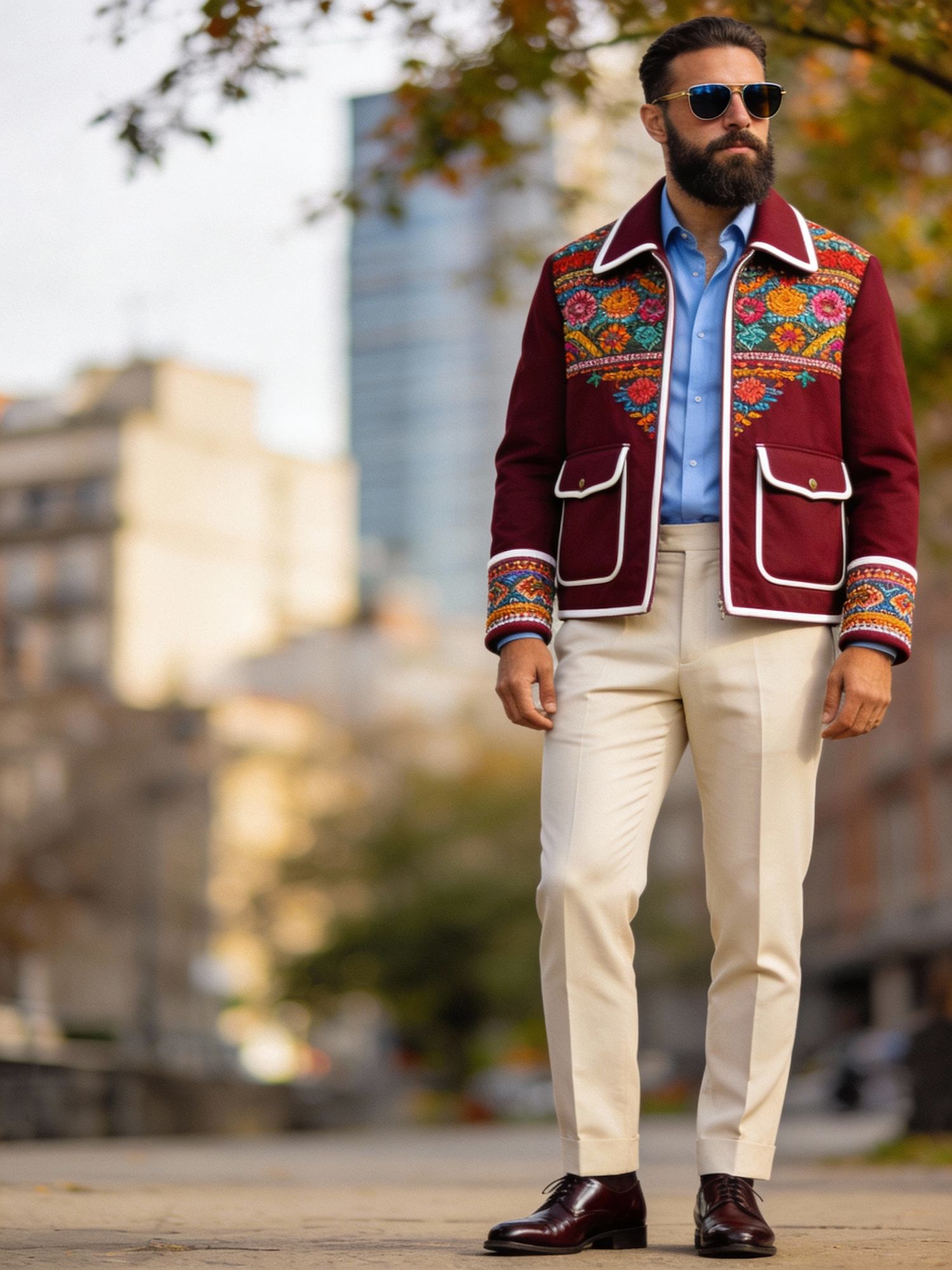 A full-body outdoor fashion portrait of a man wearing a maroon jacket with colourful embroidery and white piping on the collar, cuffs, and large front pockets. He pairs it with a light blue shirt, beige trousers, and dark brown shoes. He has a full beard and wears sunglasses. The background is softly blurred, showing an urban setting with buildings and trees. The overall mood is stylish, culturally expressive, and modern, with the embroidered jacket as the focal point.