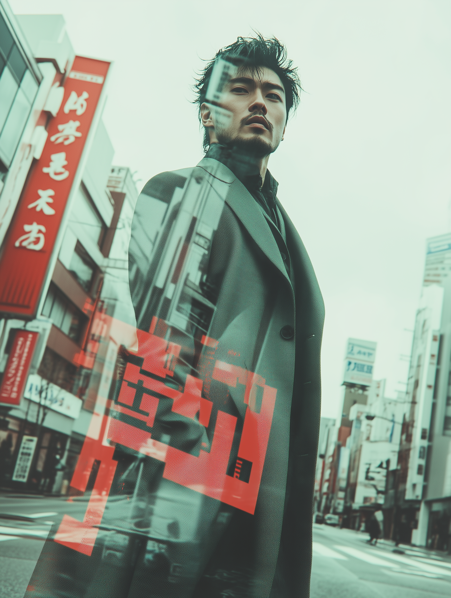 Stylish man in a tailored coat with city reflections, standing in a Japanese urban street with bold red signage and muted green tones.