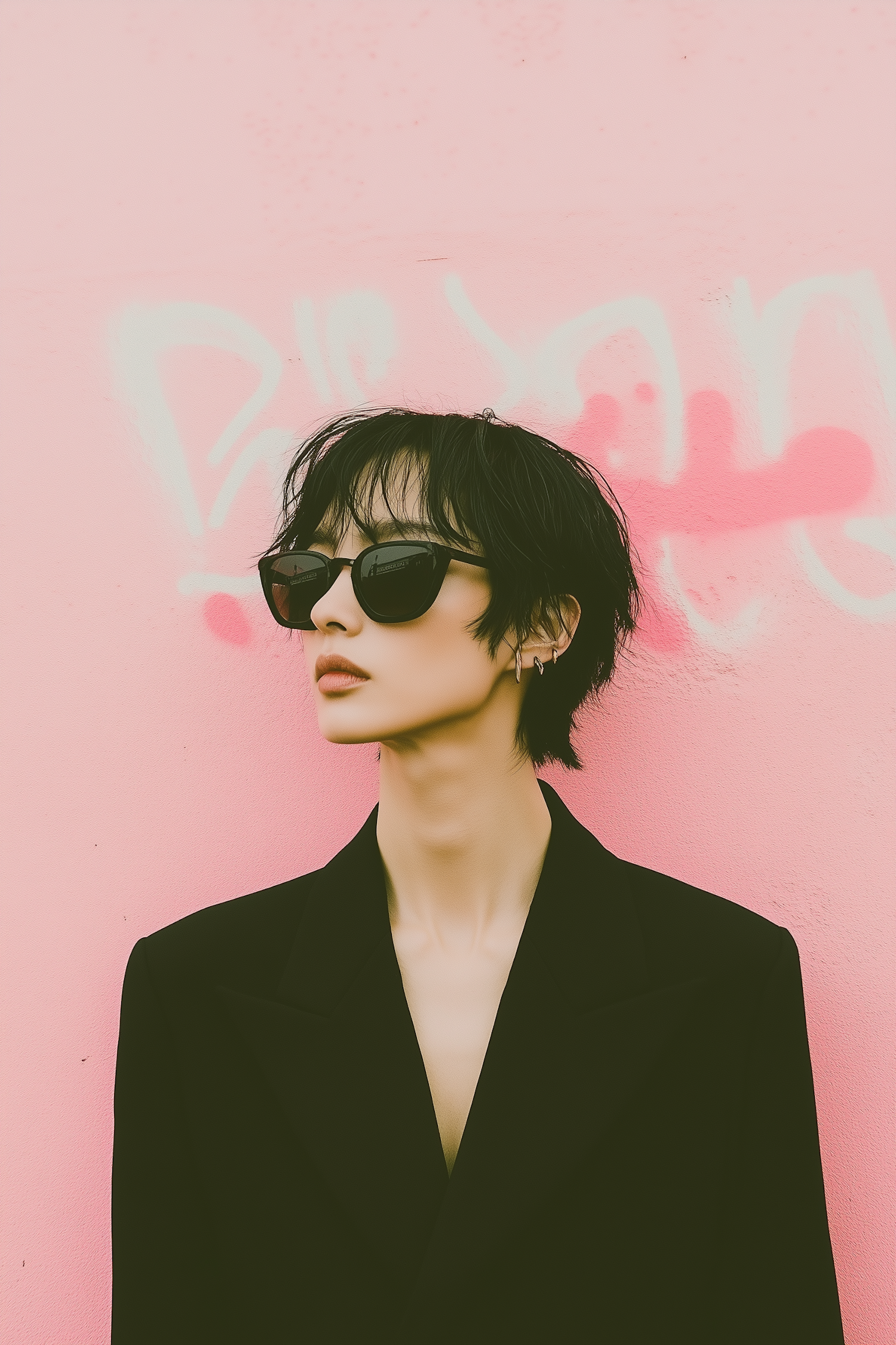 Stylish person in black blazer and sunglasses against a pink graffiti wall, exuding modern urban vibes with sharp features and edgy style.