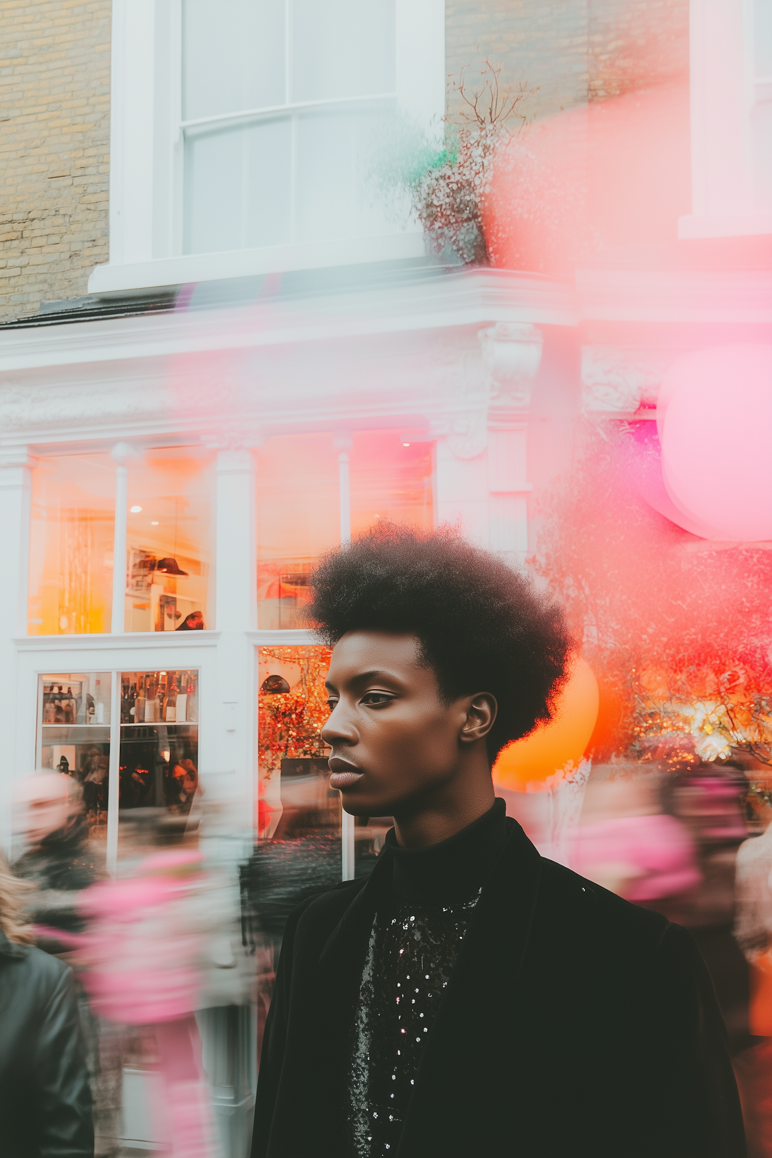 Stylish young man with an afro in a vibrant urban scene, wearing a black velvet jacket and sequined top. Blurred colorful background.
