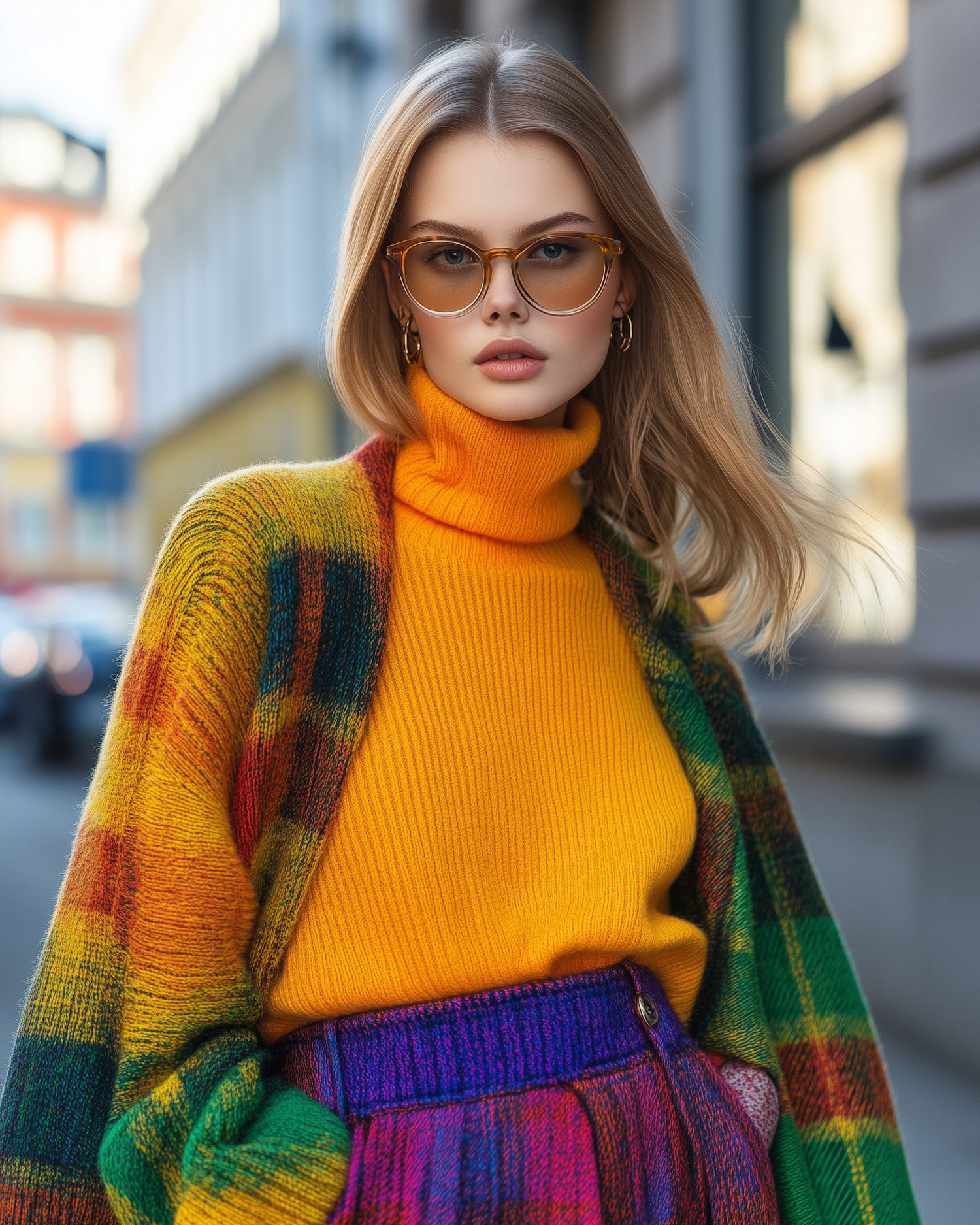 Stylish woman in a vibrant orange turtleneck, plaid cardigan, and skirt, accessorized with amber glasses and gold earrings in an urban setting.