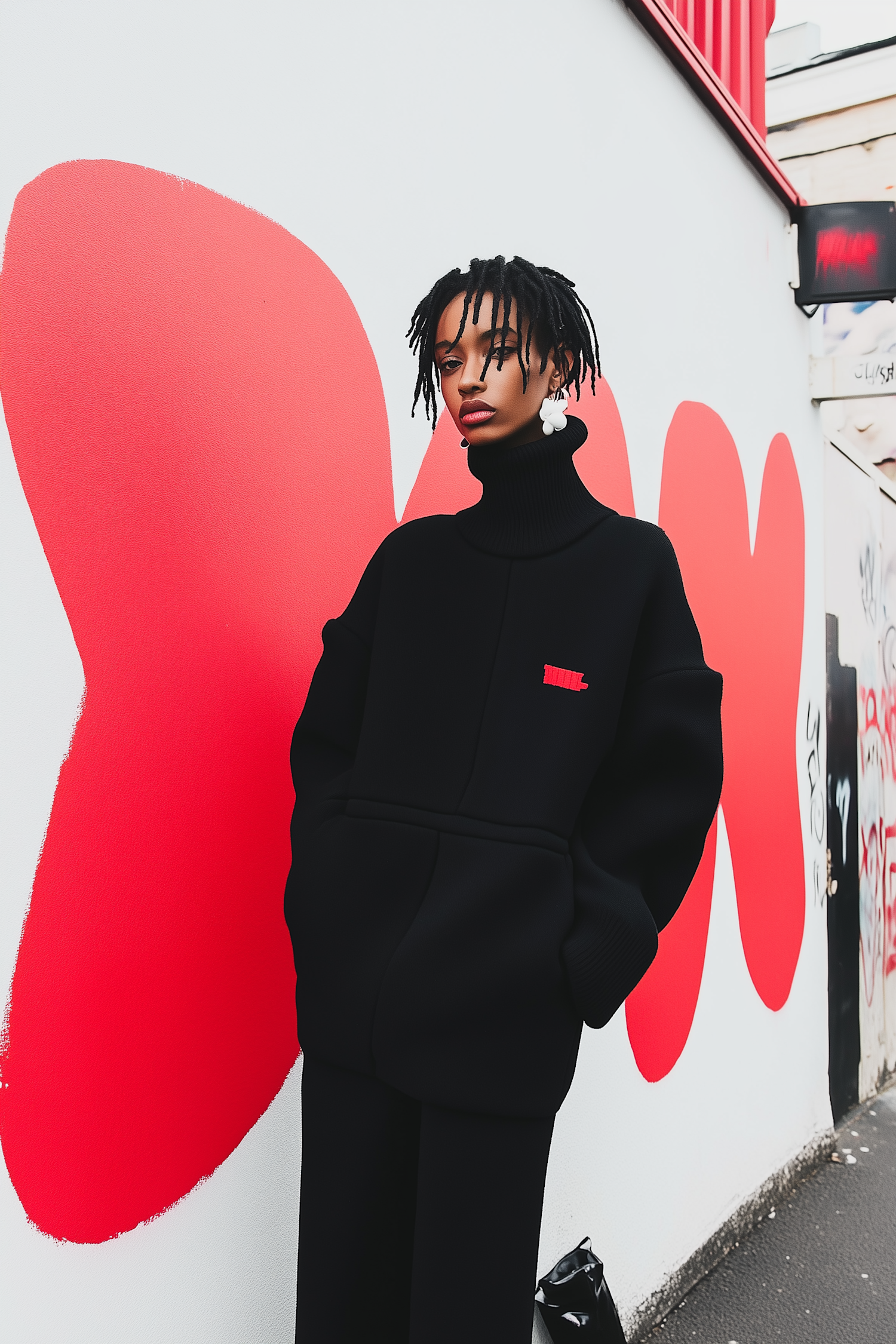Stylish woman in black turtleneck with bold red lipstick poses against a white wall with red abstract shapes in an urban setting.