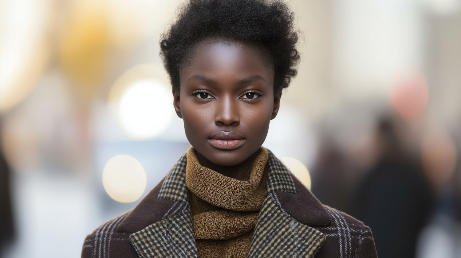 Stylish young woman with natural curls, wearing a plaid coat and mustard scarf, set against a blurred urban background with bokeh lights.