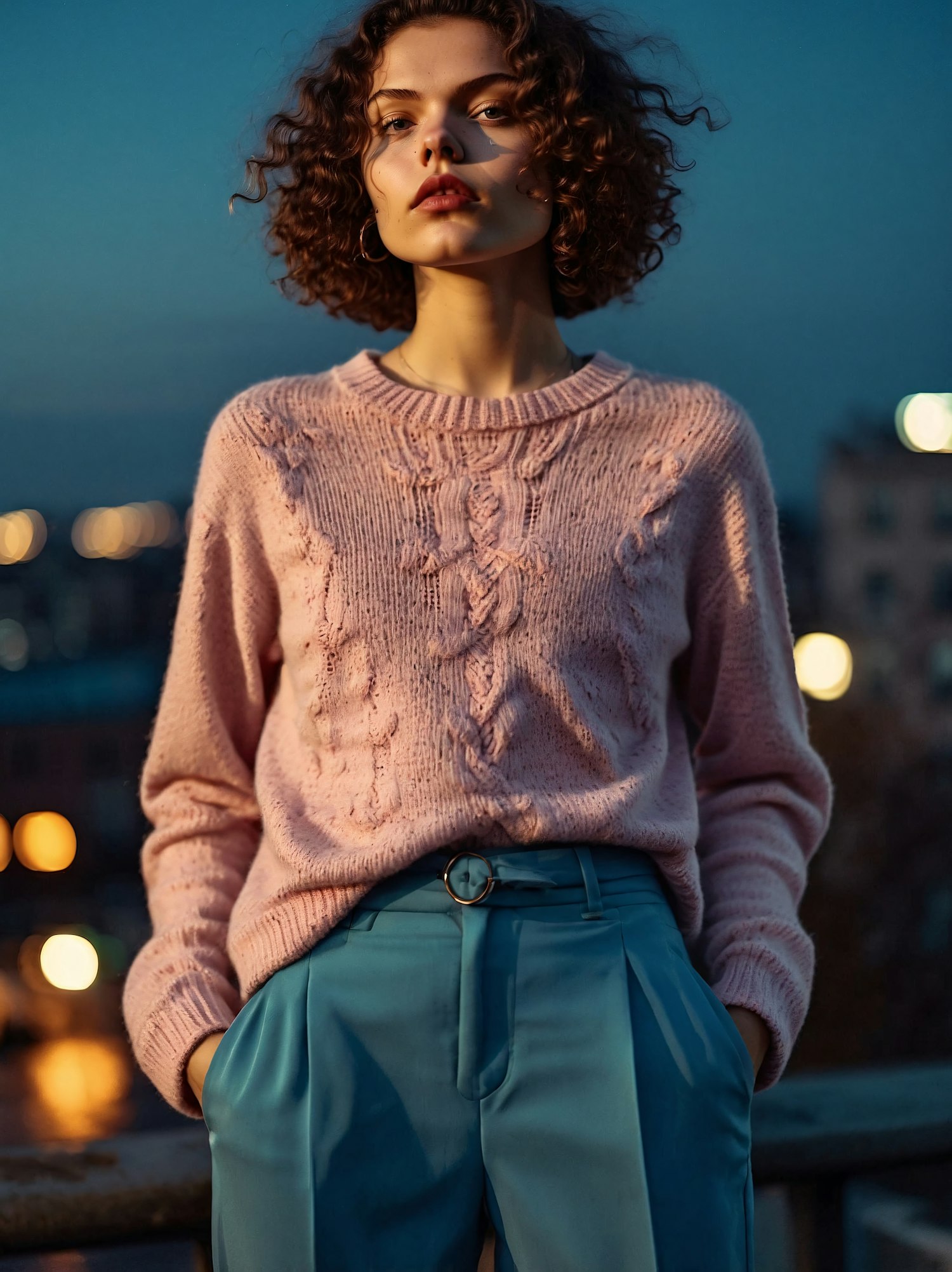 Stylish woman in pink sweater and teal trousers against a twilight cityscape, exuding confidence and elegance.