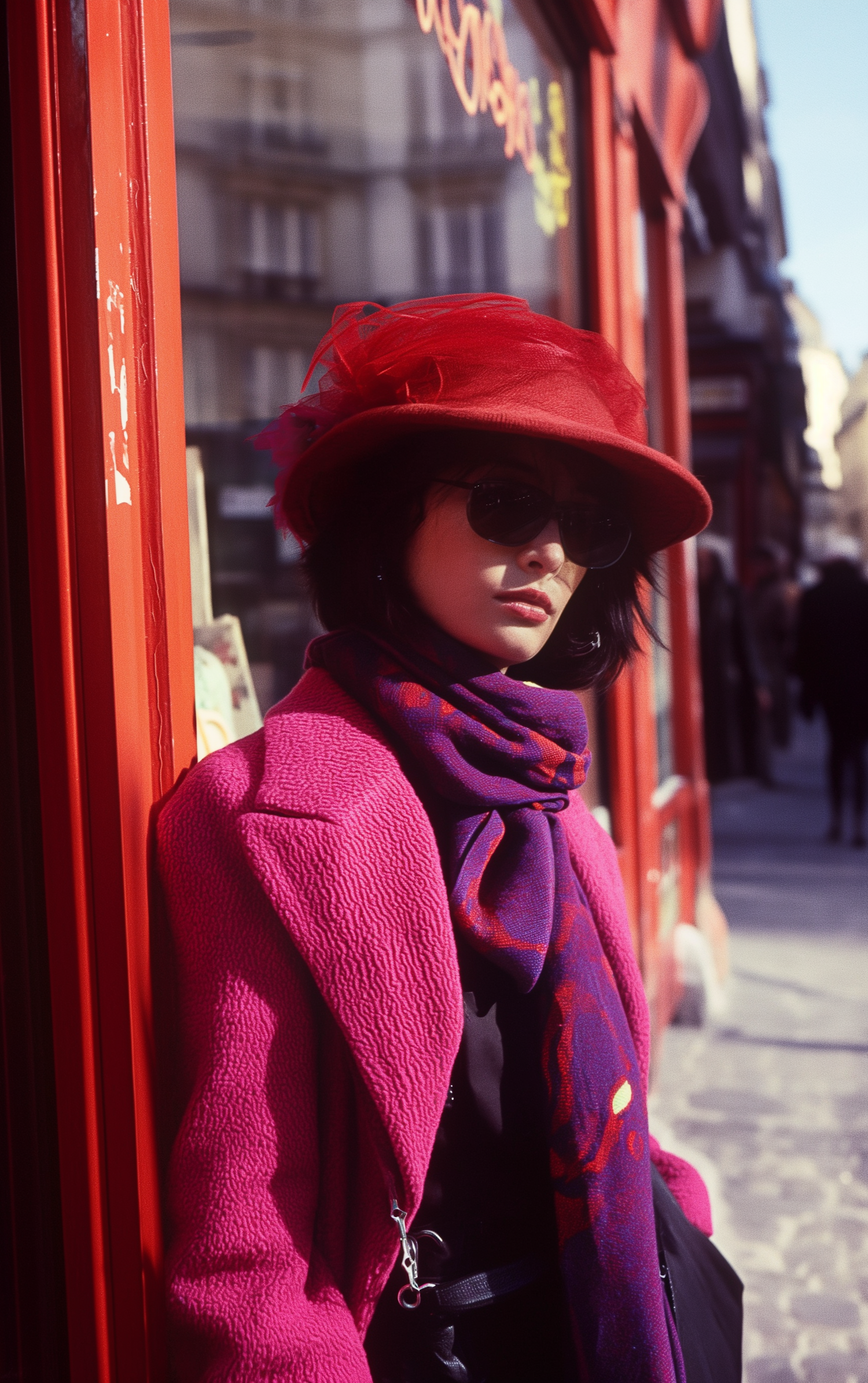 Chic woman in red hat and pink coat poses against a vibrant city backdrop, exuding elegance and style.