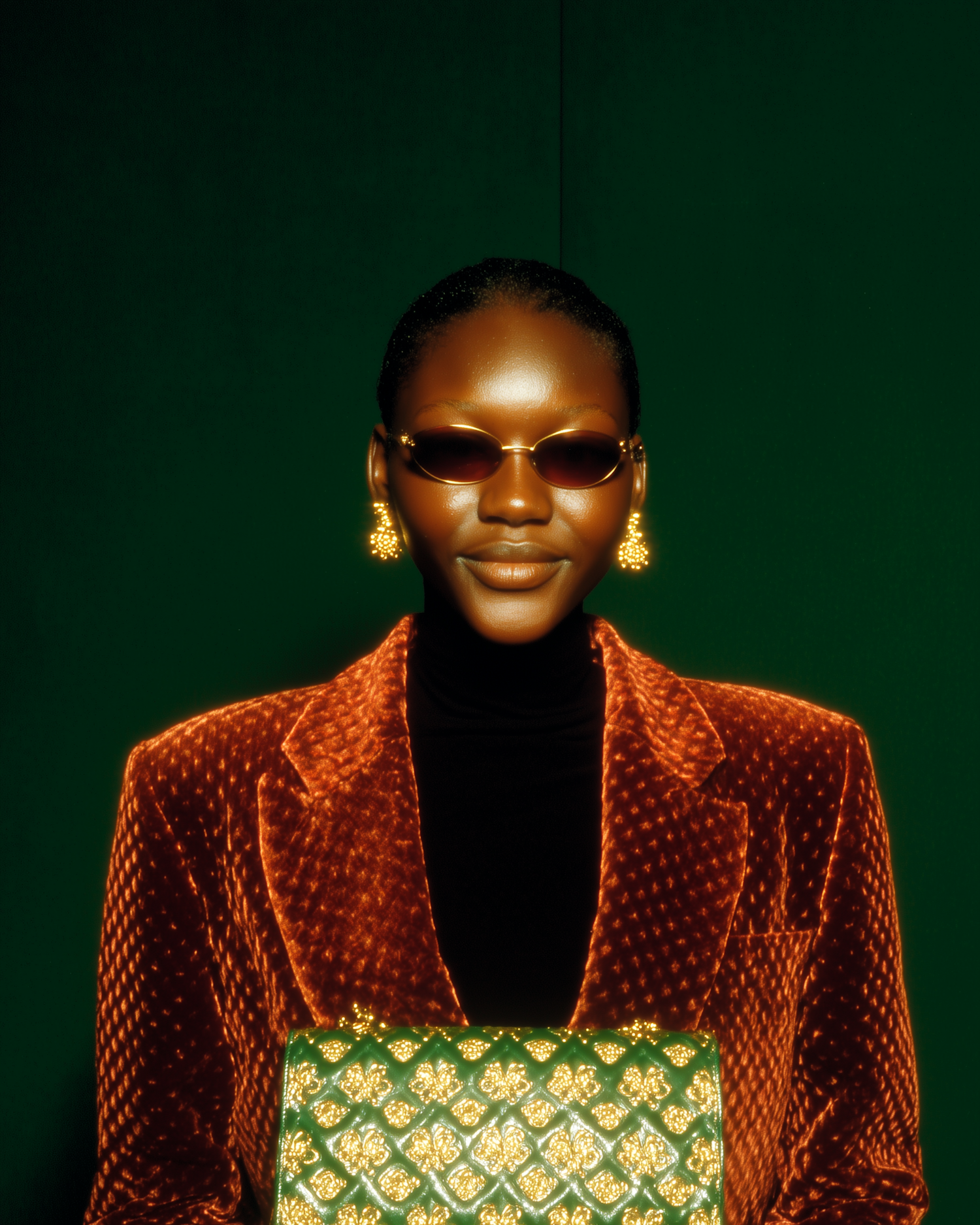 Stylish individual in orange velvet blazer, gold earrings, and sunglasses, holding a green patterned clutch against a dark green backdrop.