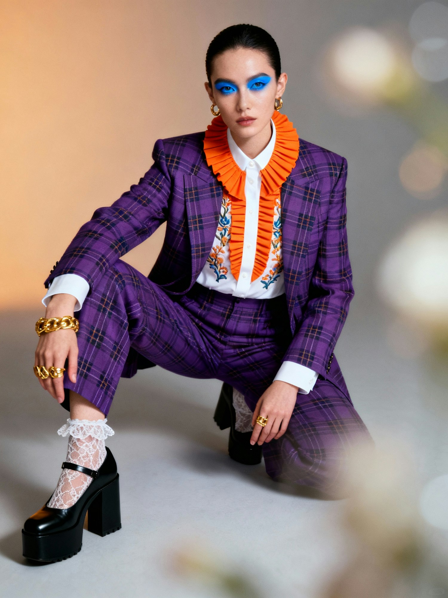 A stylish individual in a purple plaid suit with bold makeup and accessories, posing confidently in a warm, softly lit setting.