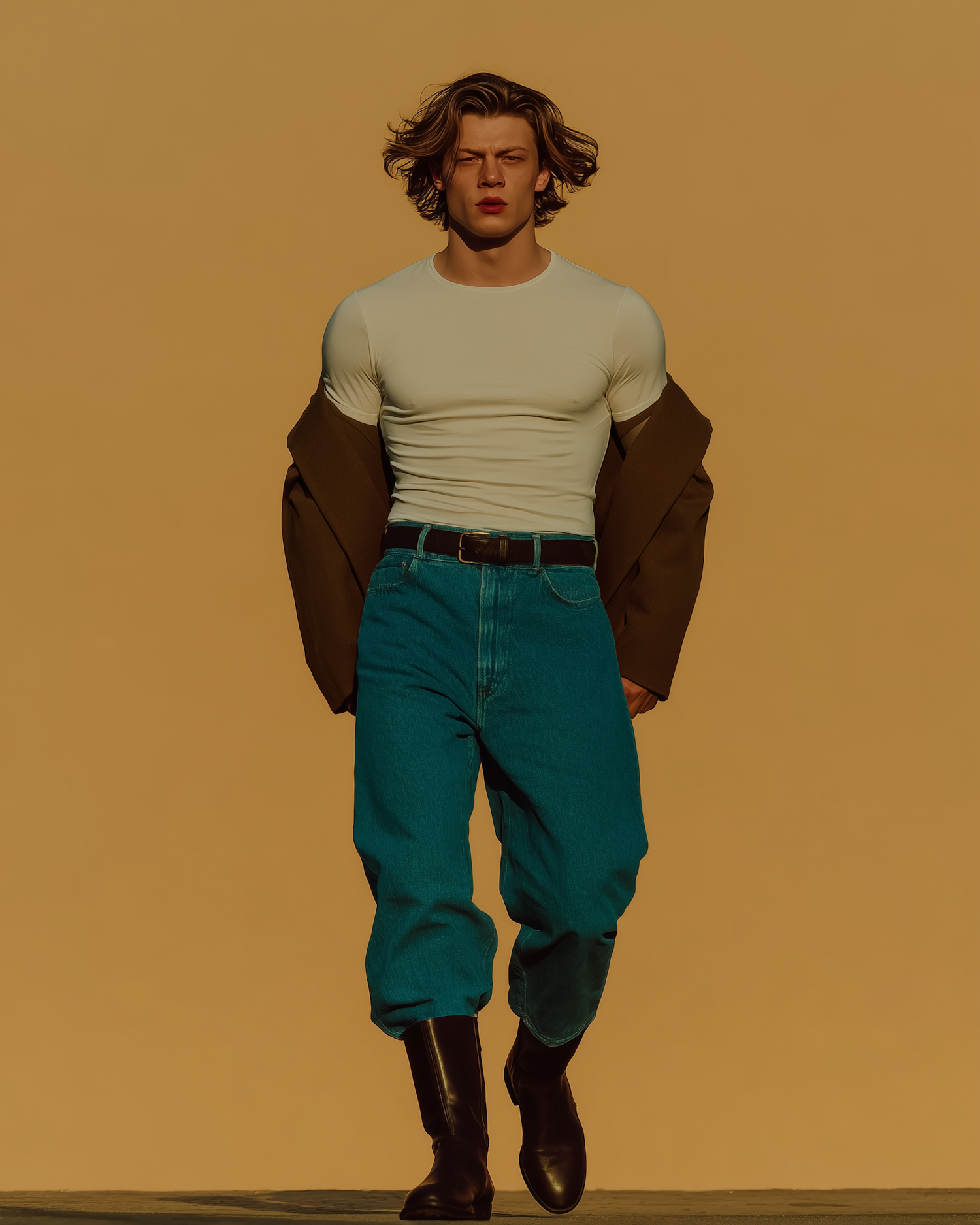 Stylish individual in a white shirt, blue jeans, and black boots against a warm beige background, exuding a modern and minimalist vibe.