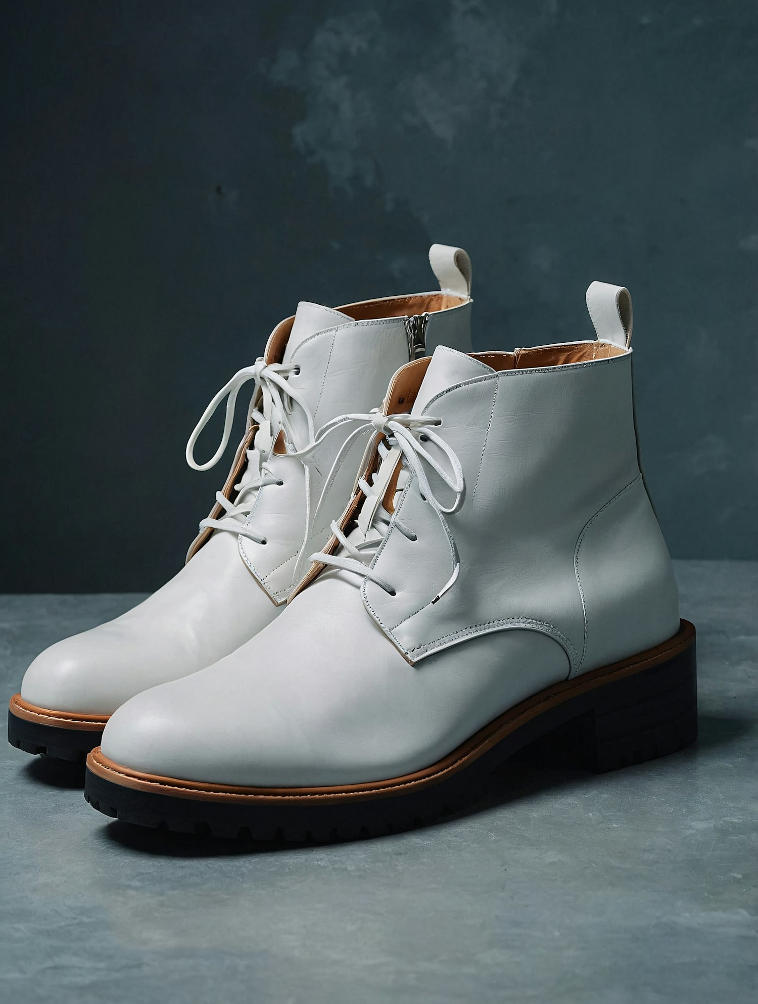 Sleek white leather ankle boots with lace-up design, rugged black soles, and a contrasting tan welt for a modern, stylish look.