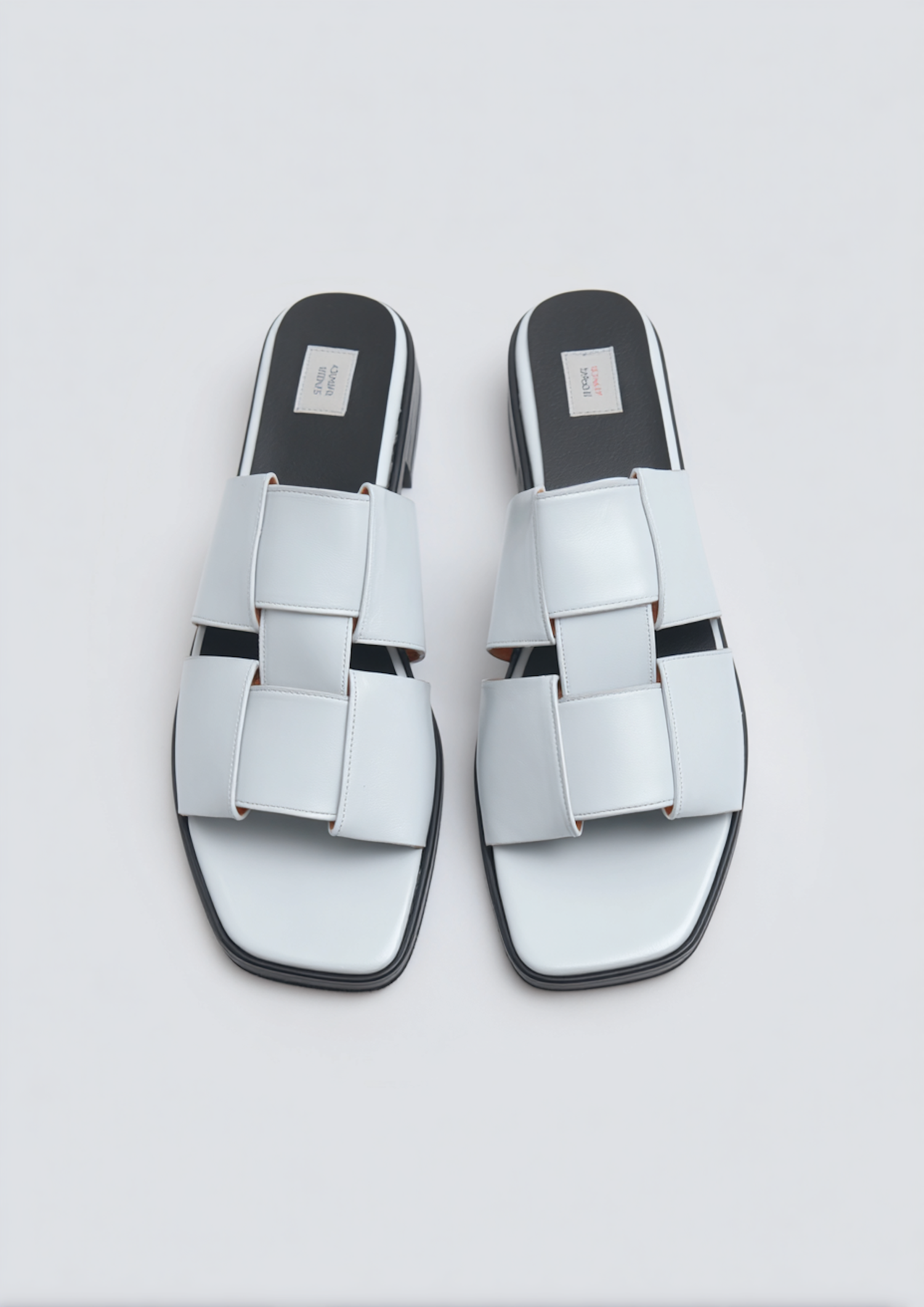 Elegant white leather sandals with a woven strap design and square-toe shape, perfect for casual or semi-formal occasions.