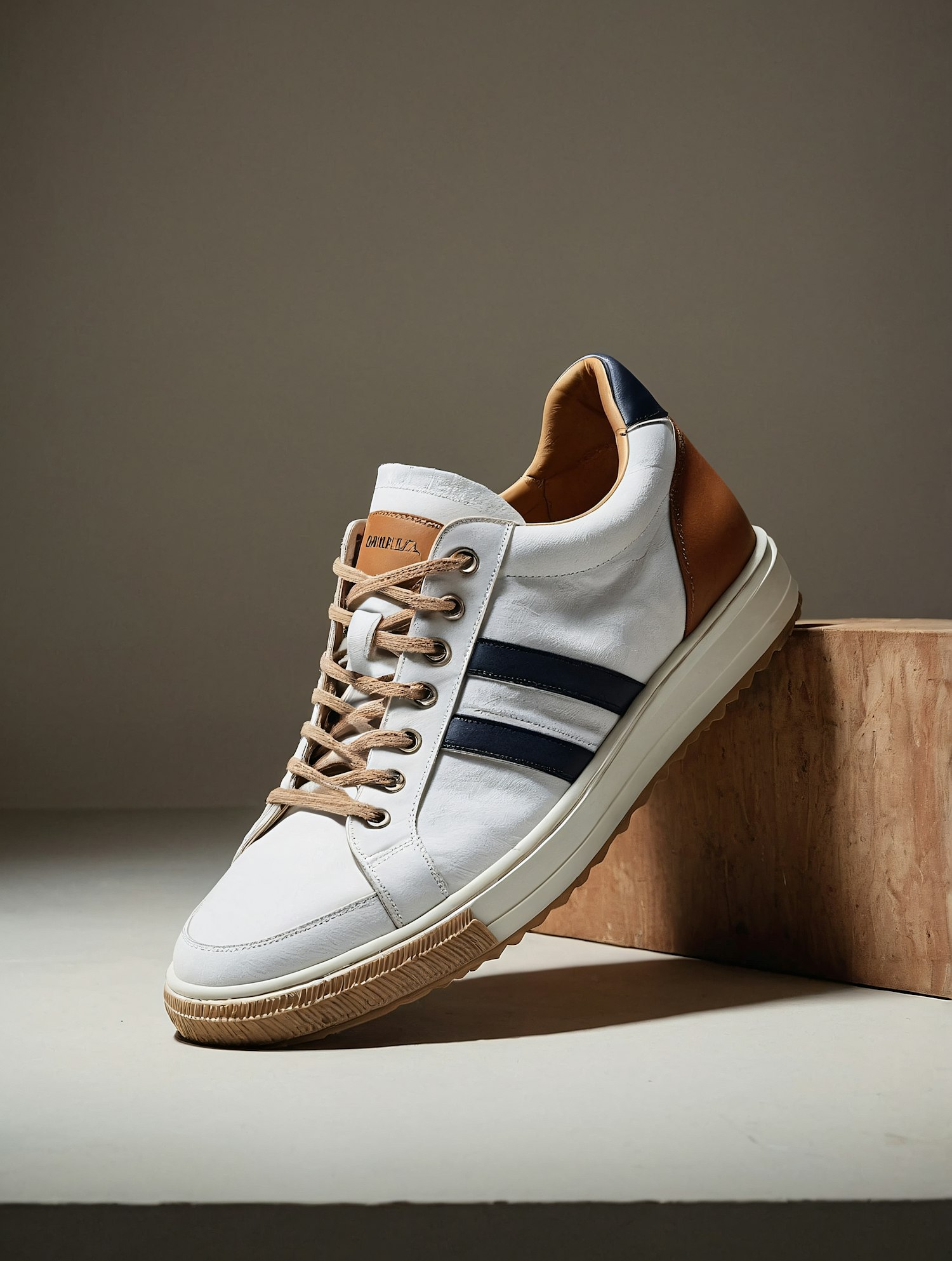White leather sneakers with navy stripes, tan accents, and beige laces, styled on a wooden block for a modern, casual look.