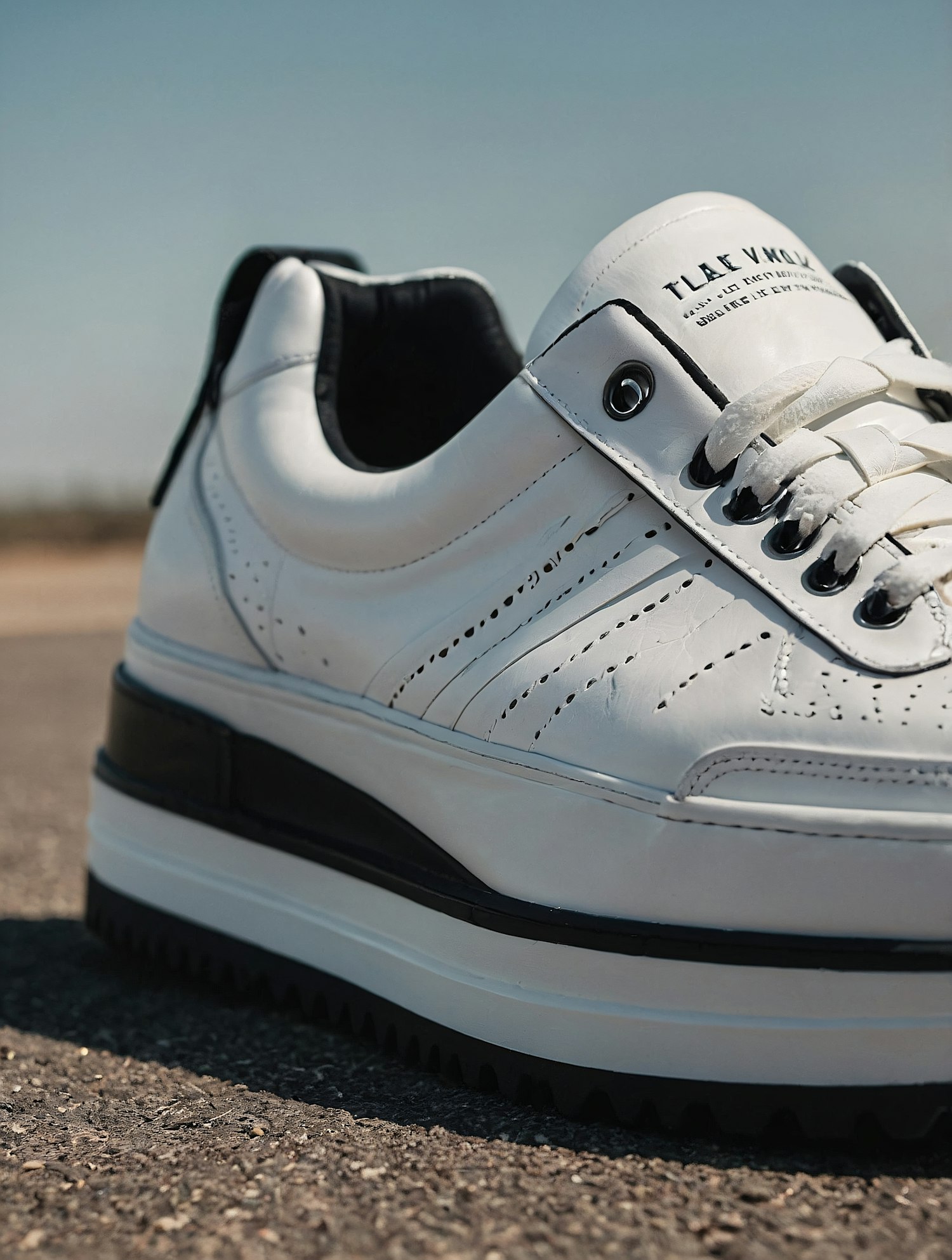Close-up of a white sneaker with black accents, perforated design, and thick sole on asphalt under bright daylight.