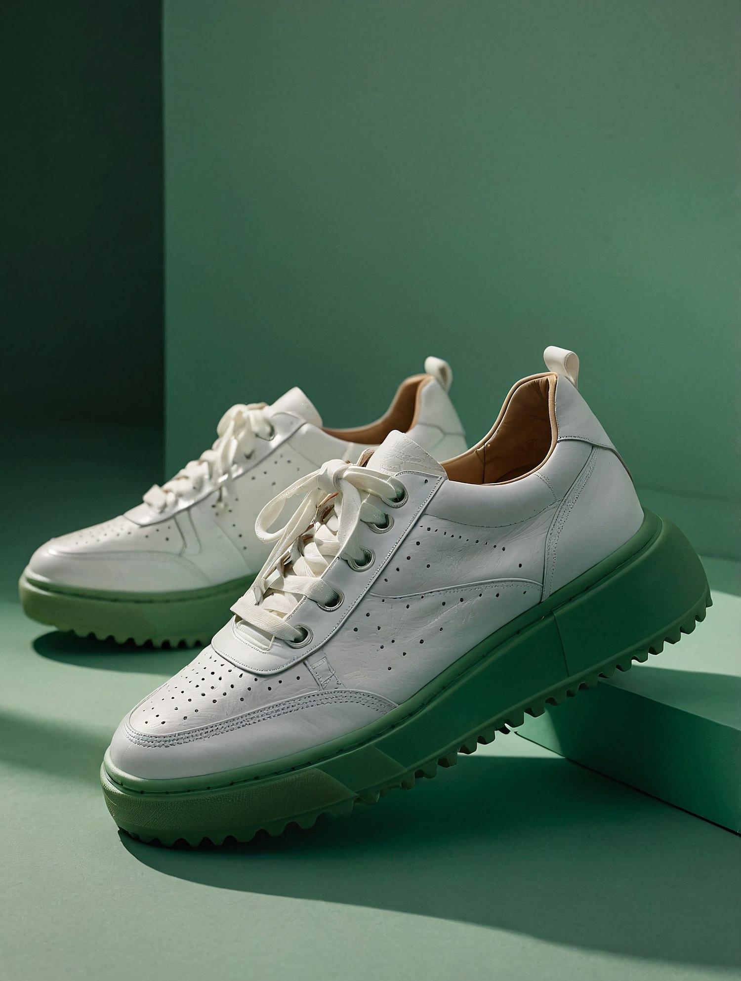 Trendy white sneakers with perforated uppers and bold green soles, perfect for a modern, sporty look. Stylish and comfortable design.
