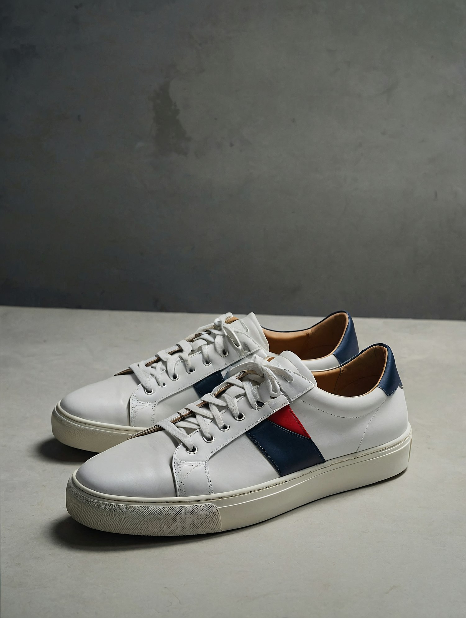 White leather sneakers with navy and red accents, tan lining, and a clean low-top design. Perfect for casual or semi-formal looks.