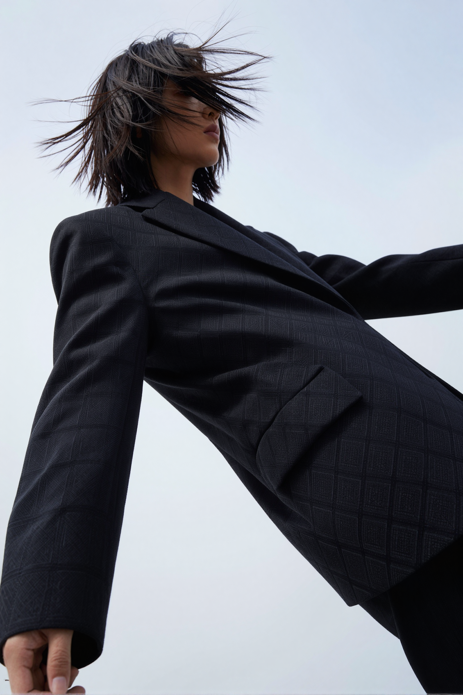 Stylish individual in a dark suit with wind-swept hair, captured from a low angle against a clear sky, creating a dynamic and modern look.