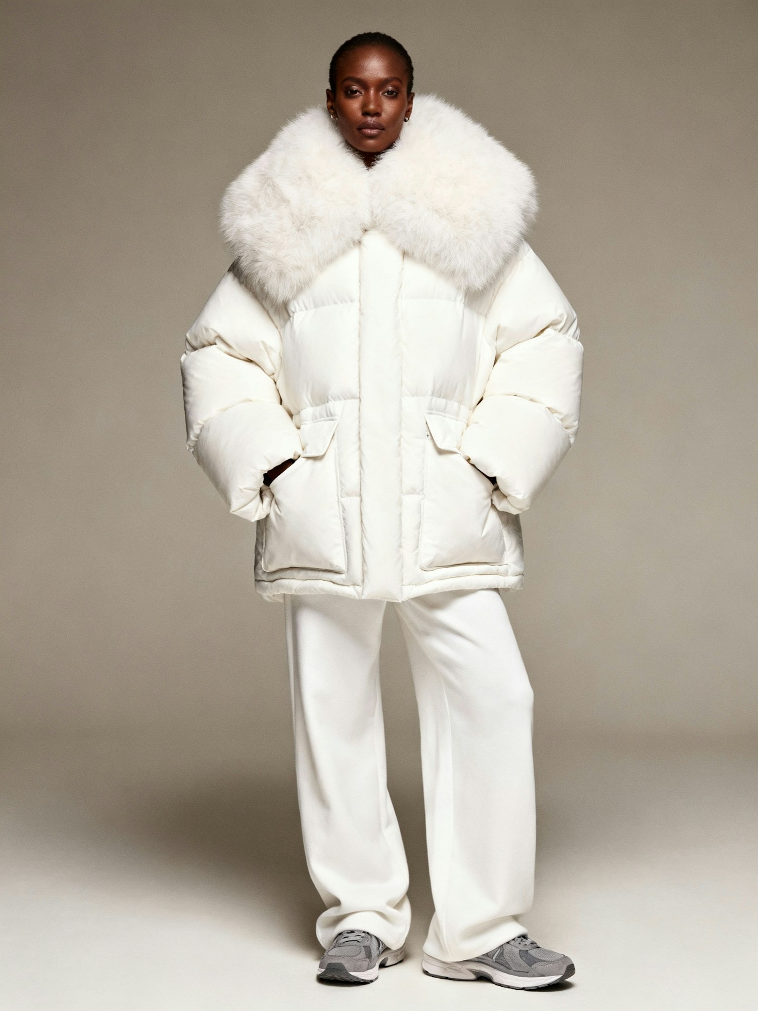 Stylish individual in a white puffer coat with a fur collar, paired with white pants and gray sneakers, standing in a neutral studio setting.