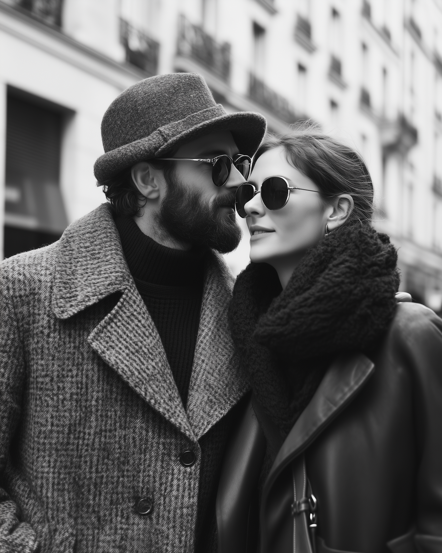 Stylish couple in winter attire, sharing a moment on a city street. Both wear sunglasses and cozy coats, exuding warmth and intimacy.