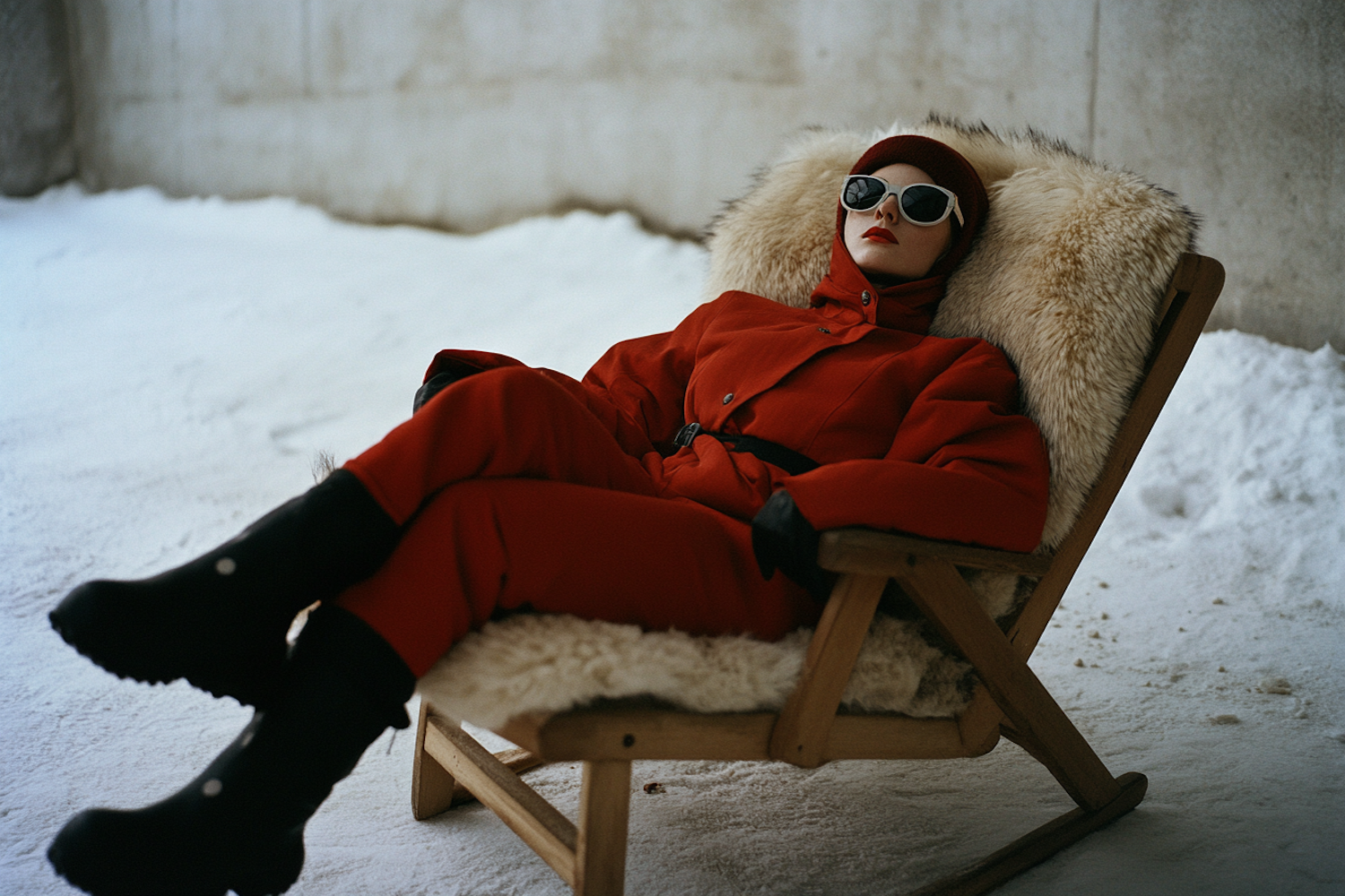 Person in red winter attire lounging on a fur-covered chair in the snow, wearing sunglasses and a hat, exuding style and comfort.