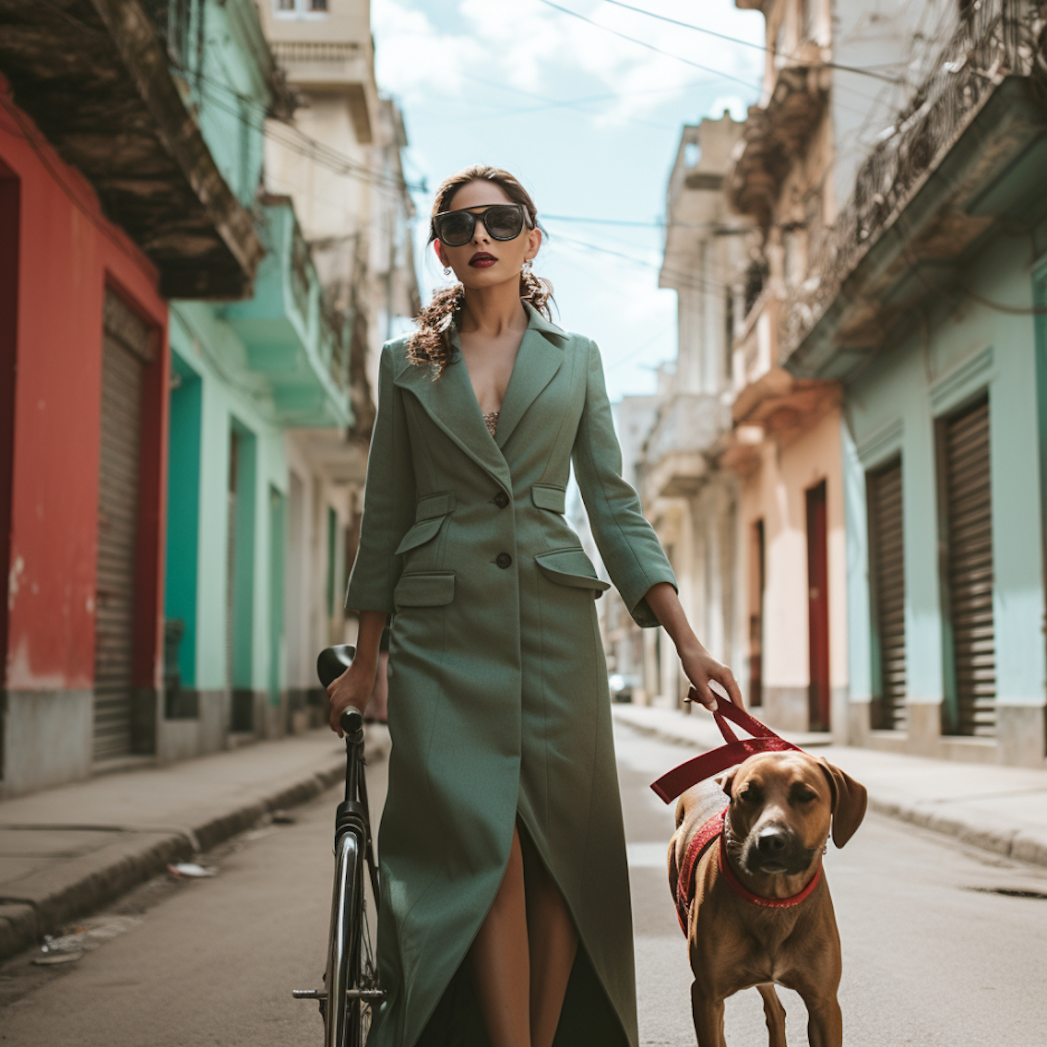 Stylish woman in green coat walks dog and holds bike on colorful city street, exuding confidence and elegance.