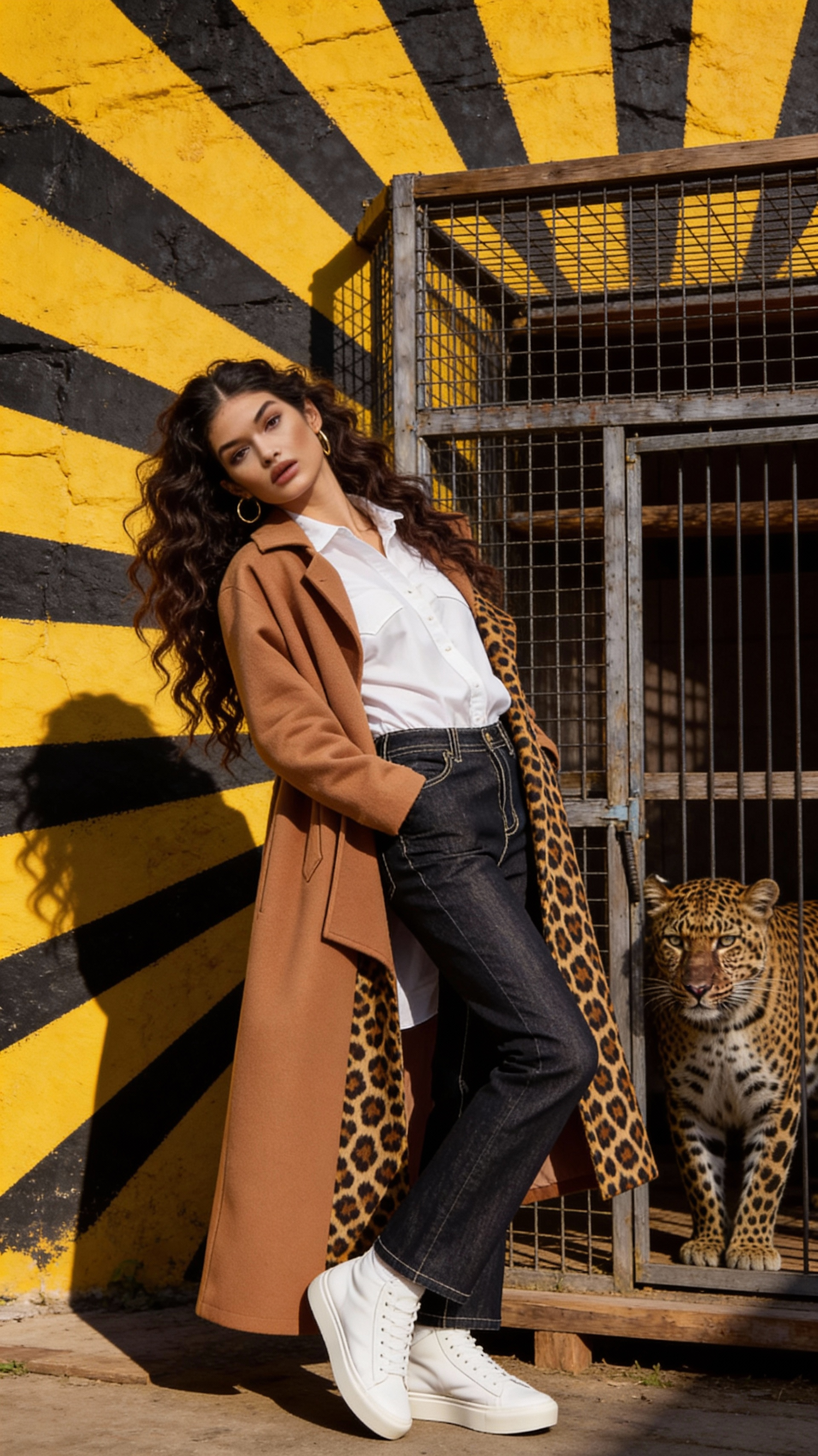 Stylish woman in a camel coat with leopard print lining poses near a caged leopard against a bold yellow and black striped wall.