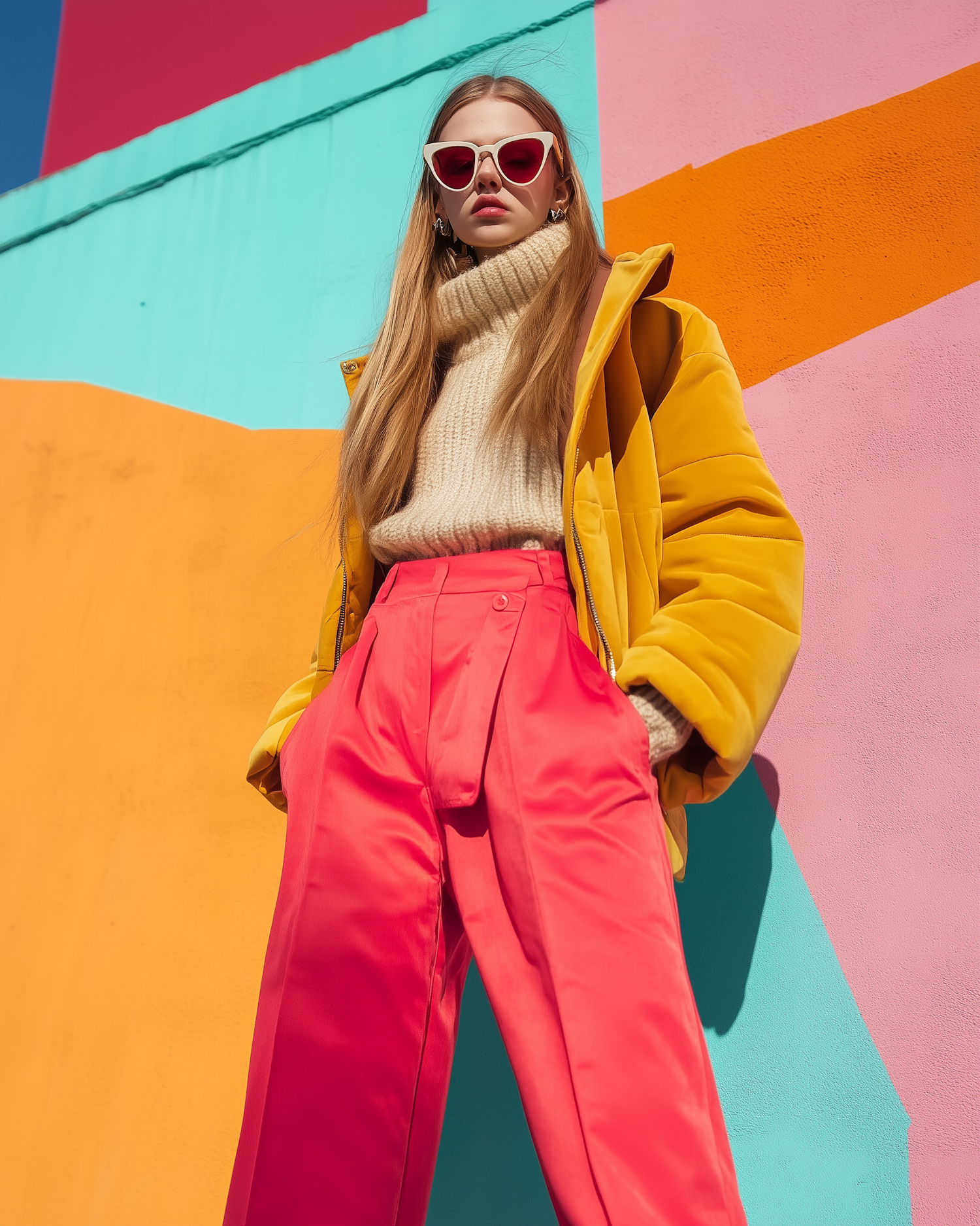 Bold fashion meets vibrant art! A woman in a yellow jacket and pink pants poses against a colorful geometric mural.
